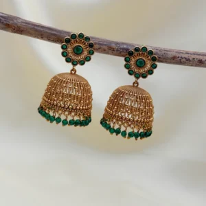 These are not just earrings – they are heirlooms in the making. The luxurious matte gold plating exudes old-world opulence while feeling feather-light on your ears, letting you celebrate in comfort from mehendi nights to wedding pheras. Pair them with silk sarees, heavy lehengas, anarkalis, or even fusion kurtas – their timeless emerald-gold combination instantly transforms you into ethnic royalty.