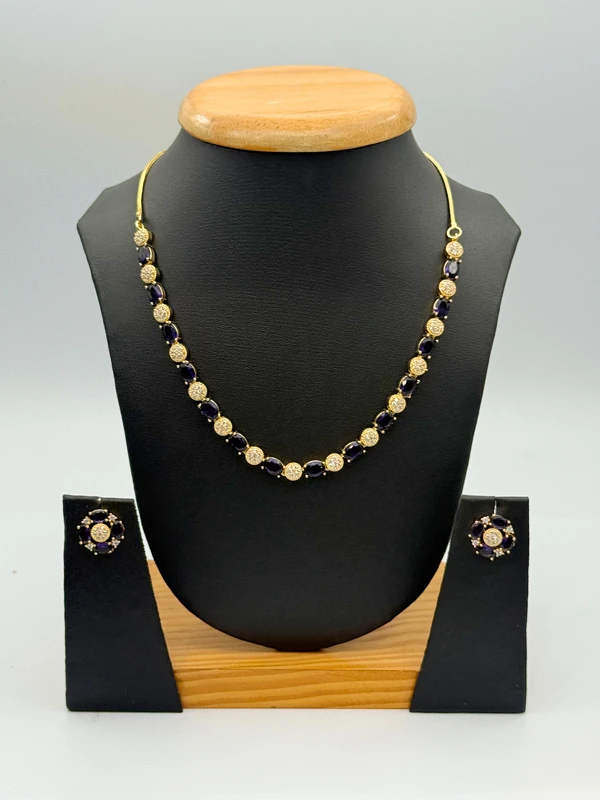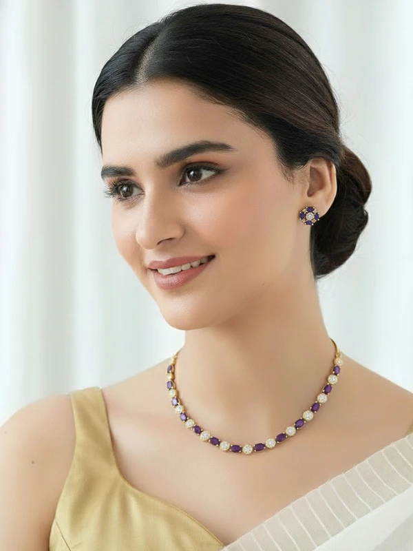 Elegant gold-toned necklace set featuring rich amethyst-purple gemstones alternated with dazzling American Diamond (AD) stones. Includes matching floral earrings for a sophisticated, royal look. Perfect for weddings, parties, and evening wear.