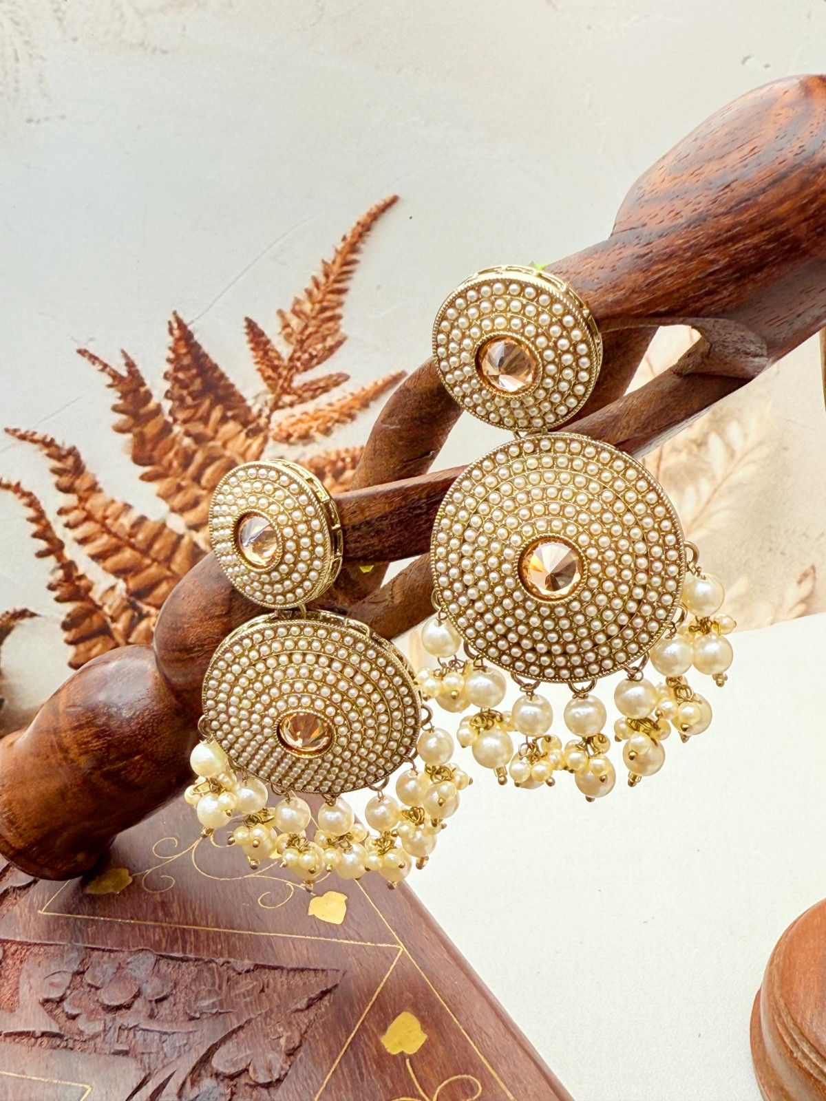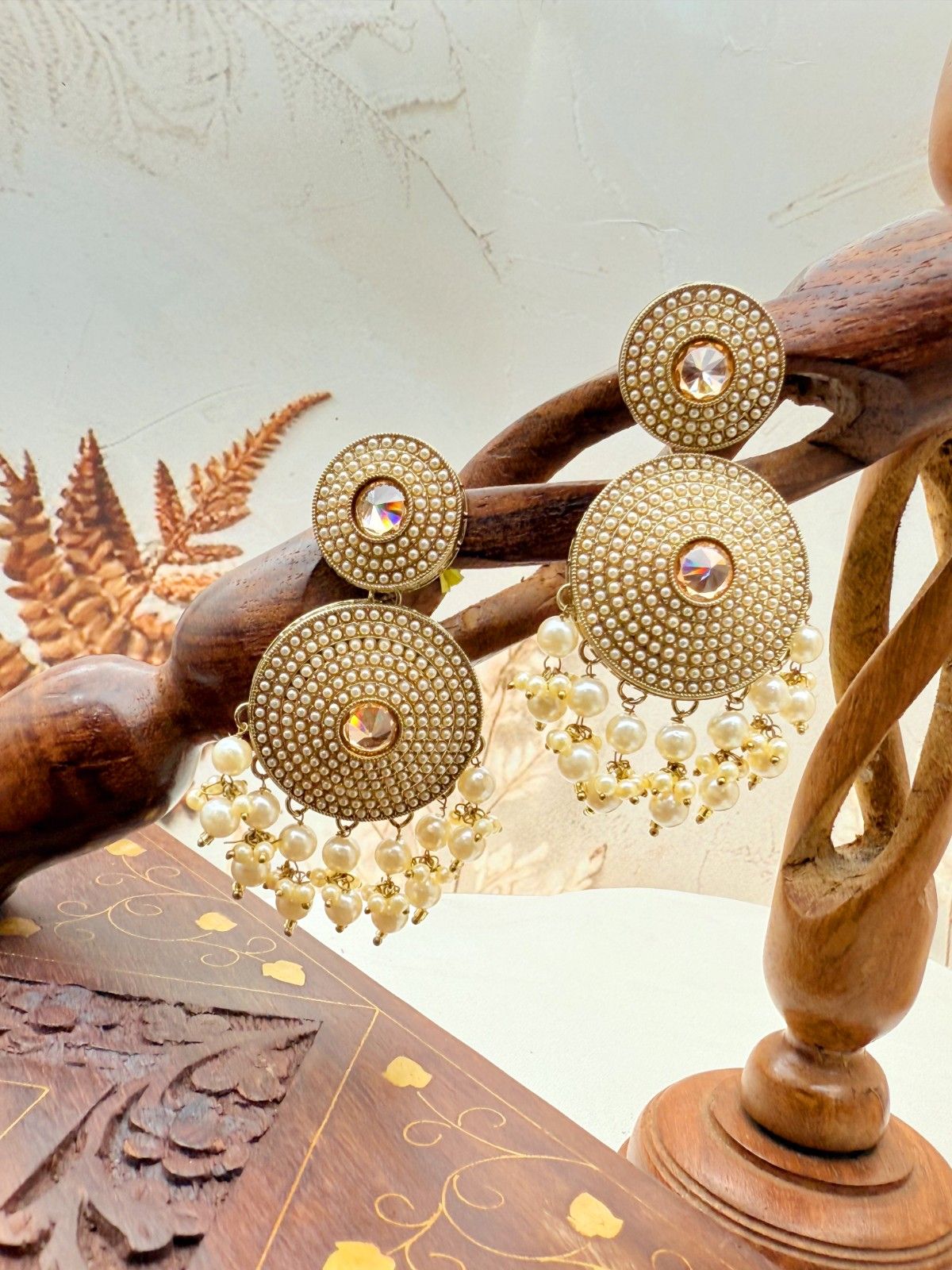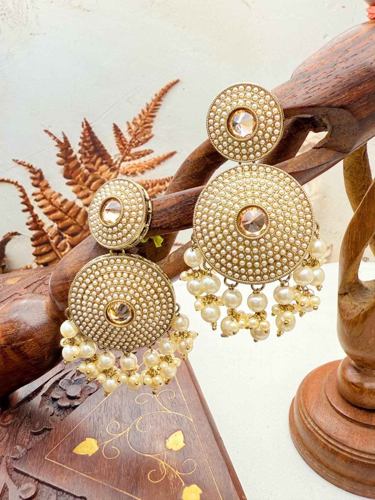 This distinctive pair stands out with its bold, circular design, covered entirely in tiny, luminous faux pearls. They offer a uniquely attractive and eye-catching texture that catches the light beautifully.