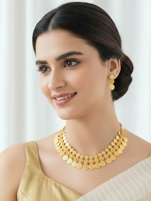 Celebrate Kerala tradition in pure gold elegance — add this antique coin flower necklace set to your jewellery collection today! ✨