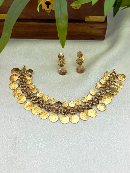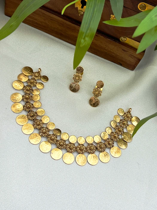 Handcrafted in warm antique gold-tone finish, the graceful crescent necklace features multiple rows of shiny gold coins beautifully alternated with delicate flower motifs. Each coin and flower is meticulously detailed, giving that rich vintage texture and authentic traditional look. The design is finished with tiny gold bead accents that add subtle movement and elegance. Matching earrings with coin & flower detailing complete this regal ethnic set.