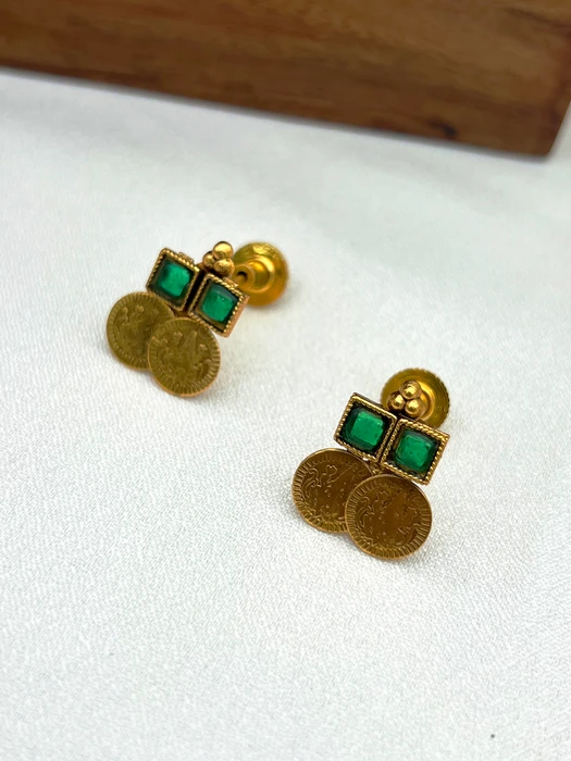 Antique gold-plated Emerald Coin Necklace Set with layered coin design, vibrant emerald stones & matching earrings. Classic traditional Kerala jewellery for weddings, Onam, Diwali & bridal wear!