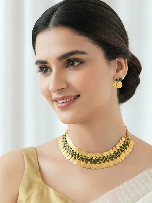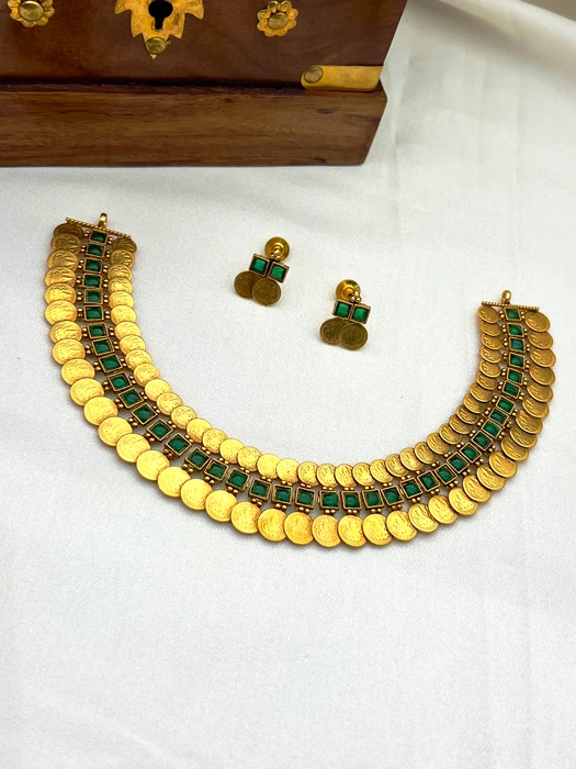 Handcrafted in rich antique gold-tone finish, the graceful crescent necklace features multiple rows of lustrous gold coins framed with vivid emerald-green stones in classic square settings. The design is beautifully finished with delicate gold bead accents and tiny pearl-like drops for added elegance and movement. Matching earrings with emerald stones and coin detailing complete this regal traditional set.