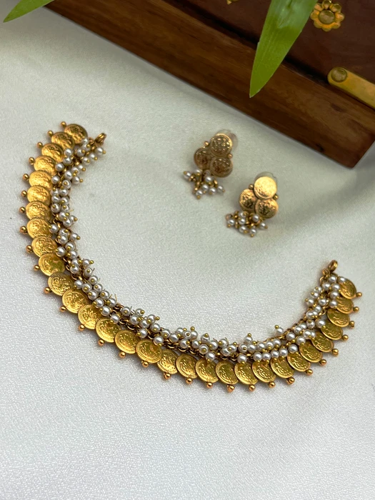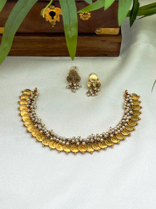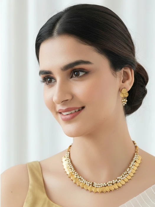 Celebrate timeless tradition with this exquisite Gold Coin Pearl Necklace Set. Rich gold-tone coins are gracefully layered with lustrous pearls and tiny golden beads, creating a regal, heirloom-inspired choker that exudes heritage charm and sophistication. The matching coin-and-pearl stud earrings complete the set with perfect harmony.