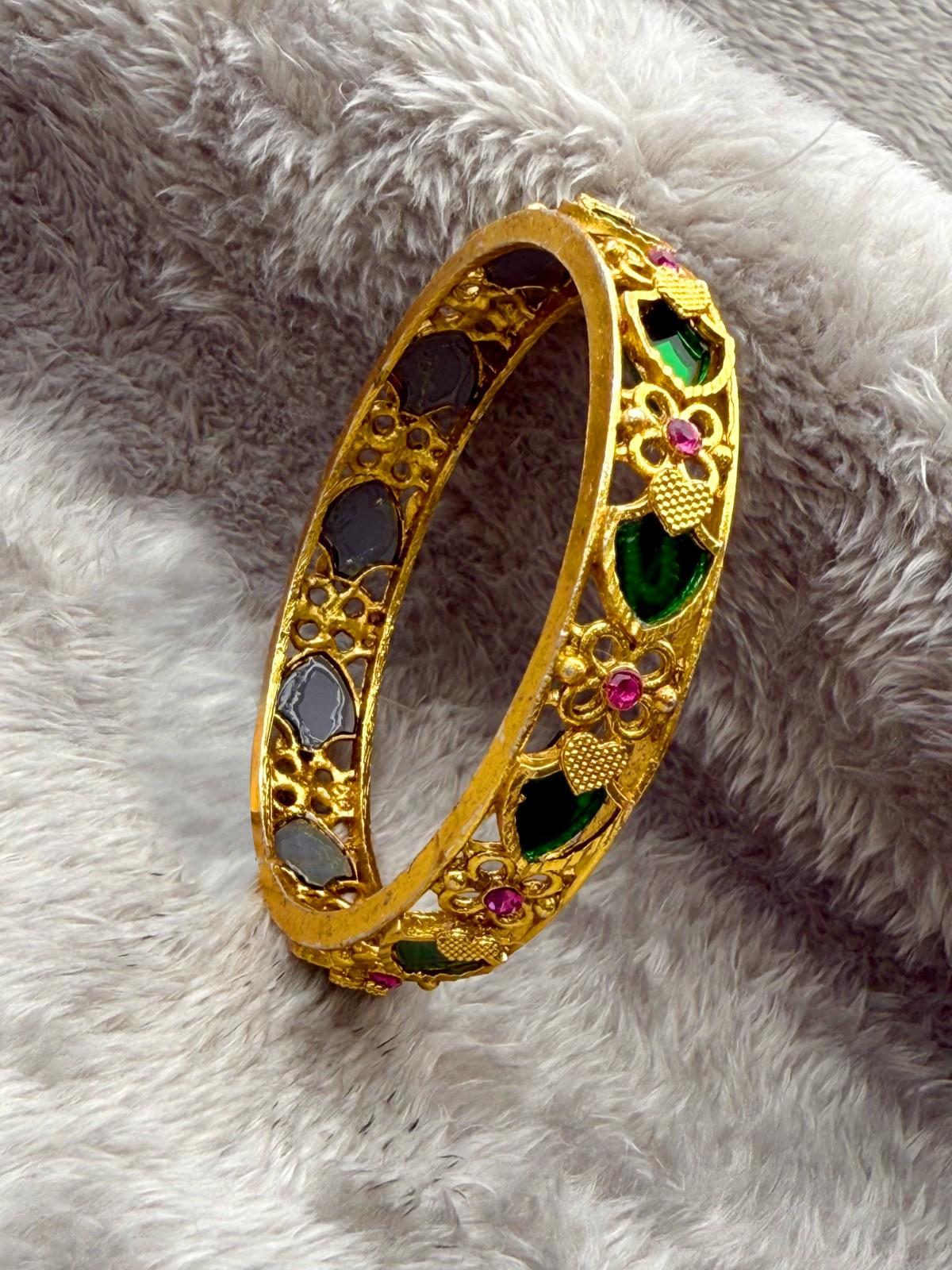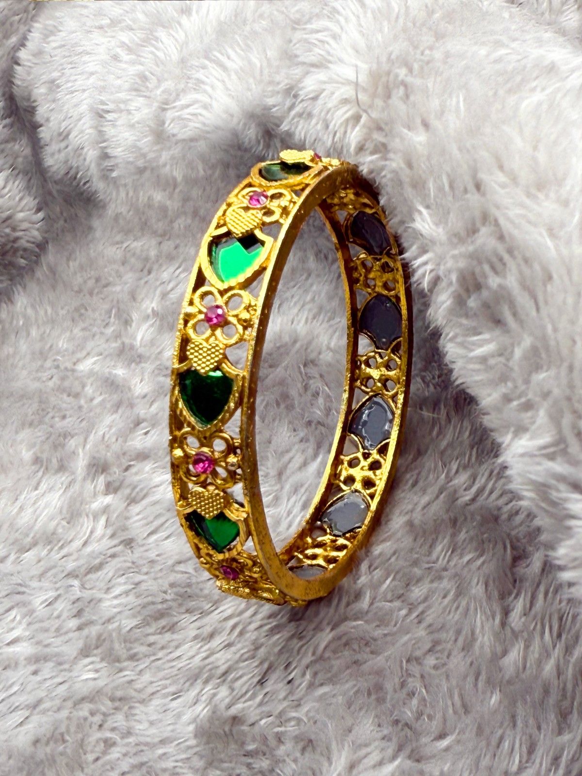 Step into the world of rich tradition with the magnificent Antique Jasmine Emerald & Magenta Bangle. This truly eye-catching piece showcases the elegant artistry of classic South Indian jewelry, featuring a delicate yet sturdy design inspired by the Jasmine vine and blooms.