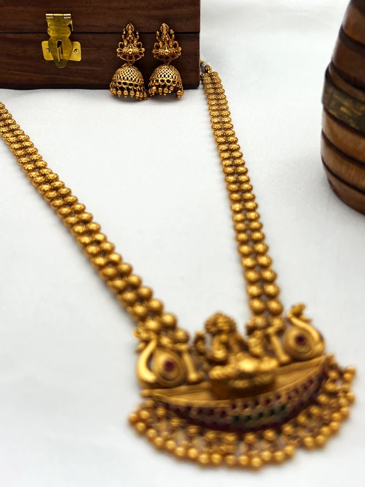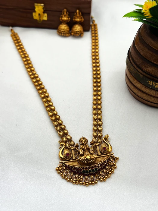 This exquisite Antique Lakshmi Long Haram is a timeless symbol of divine grace and traditional South Indian jewellery. The centerpiece beautifully depicts Goddess Lakshmi seated on a lotus inside a boat flanked by peacocks, crafted with fine filigree work, detailed motifs, and colorful stone accents. The long beaded chain with floral patterns adds richness and grandeur, while the matching traditional jhumka earrings complete the royal look.