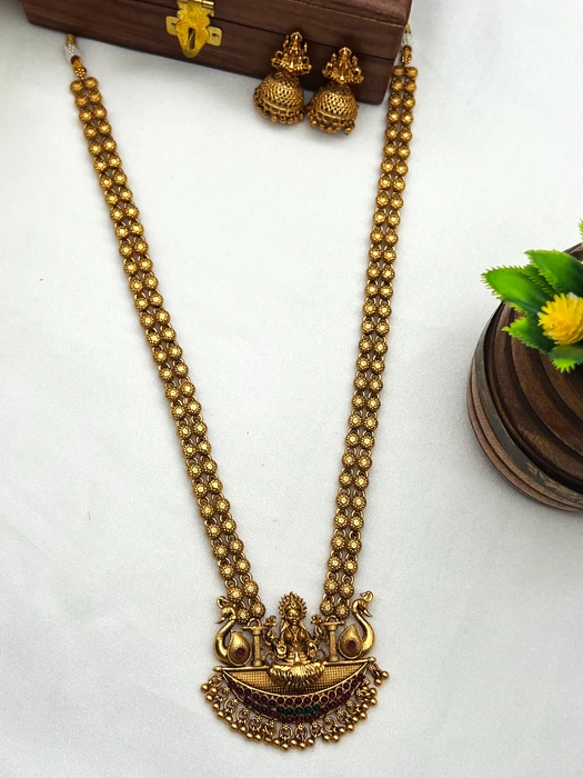 Bring home divine blessings and timeless beauty with this majestic Antique Lakshmi Long Haram – a true heirloom piece of ethnic jewellery.