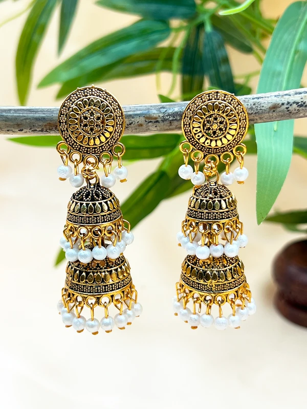 Crafted in warm antique gold-tone finish, these jhumkas feature a detailed floral disc top with paisley and motif artistry, flowing into a classic double-tier bell shape enriched with fine sparkling stone work. Layers of lustrous white pearl beads cascade beautifully from each tier, adding gentle sway, soft shimmer, and that signature traditional jingle with every movement. Lightweight yet statement-making, skin-friendly, and comfortable for all-day festive wear!