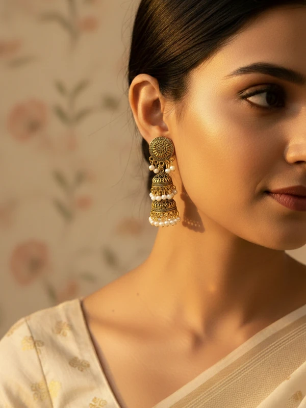 Stunning gold-tone antique jhumka earrings with intricate floral motifs, double bell design, sparkling accents, and cascading white pearl drops. Timeless ethnic elegance for weddings, festivals & bridal wear!
