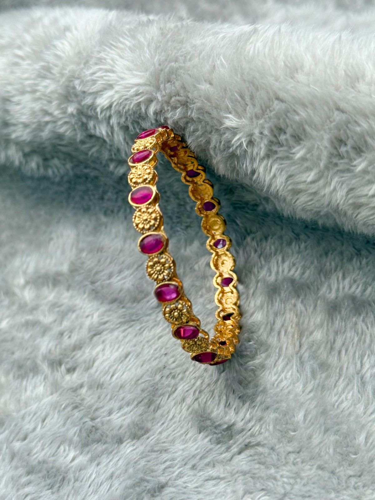 The bangle features a continuous pattern of oval-cut stones, each framed by a delicate, textured Rosette (small flower/circular) motif. The design is dominated by vibrant, deep Magenta/Ruby-tone stones, which create a luxurious and classic appearance. Small white or clear accent stones often complement the main gems, enhancing the sparkle of the traditional floral pattern.