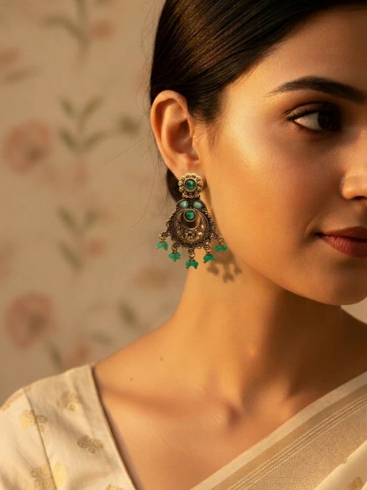 The warm, antique-inspired gold-tone finish maintains its rich glow, making these lightweight earrings the perfect match for sarees, lehengas, anarkalis, bridal looks, or festive outfits. Ideal for weddings, Navratri, Diwali, or any celebration where you want to shine with vibrant sophistication and feminine grace.