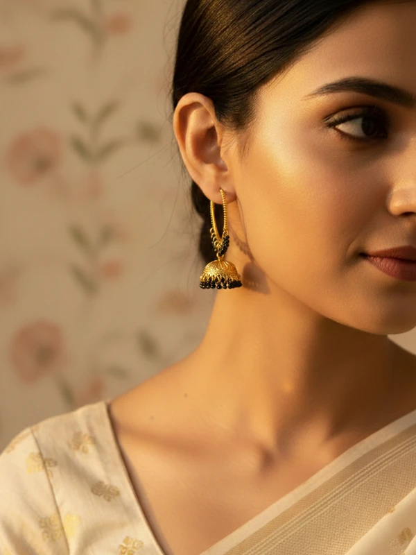 Crafted in radiant gold-tone, these jhumkas feature a textured coiled hoop base beautifully accented with deep black bead clusters for a luxurious, mysterious vibe. The intricate bell-shaped dangler is detailed with fine filigree and topped with matching black beads, creating gentle sway, rich contrast, and the signature traditional jingle. Lightweight, skin-friendly, and comfortable for all-day wear during weddings, festivals, or everyday ethnic styling!
