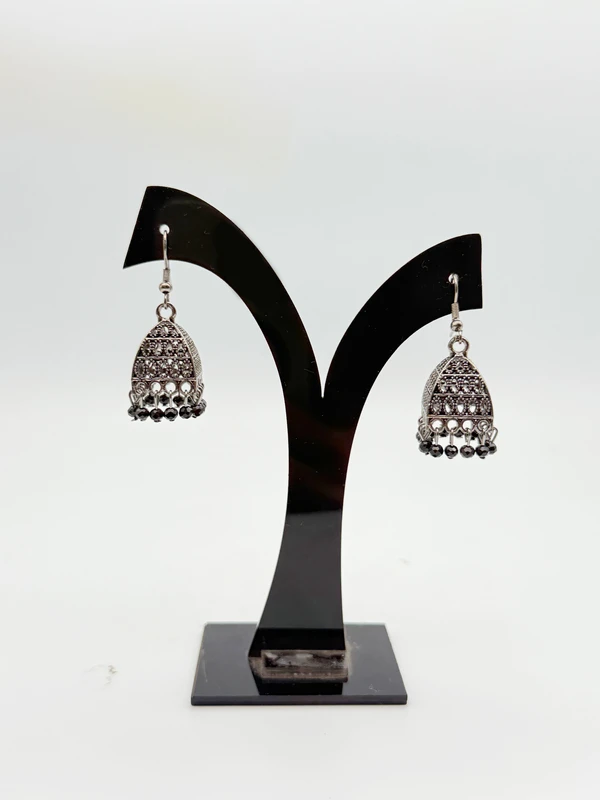 Timeless elegance in miniature: oxidized silver jhumkas crowned with glossy black beads that sway with mysterious allure and regal charm.
