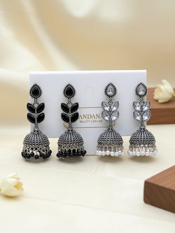 Double the drama, endless elegance. This stunning silver-tone oxidised jhumka combo gives you two iconic pairs: one wrapped in mysterious black stones with matching beads, the other glowing in pure white brilliance with delicate pearls. Intricate antique detailing and perfect dome shape create that signature sway every traditional lover craves. Bold yet lightweight, they’re your new go-to for effortless regal charm.
