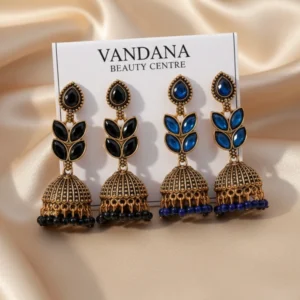 Two sacred lotuses, twice the enchantment. This exquisite gold-tone combo brings you two mesmerising meenakari jhumkas: one drenched in regal sapphire blue petals, the other ablaze in passionate magenta glory. Each handcrafted dome is wrapped in intricate lotus motifs and finished with playful bead drops that dance with every step. Rich antique gold-tone glow meets vibrant colour for the ultimate fusion of heritage and modern romance.