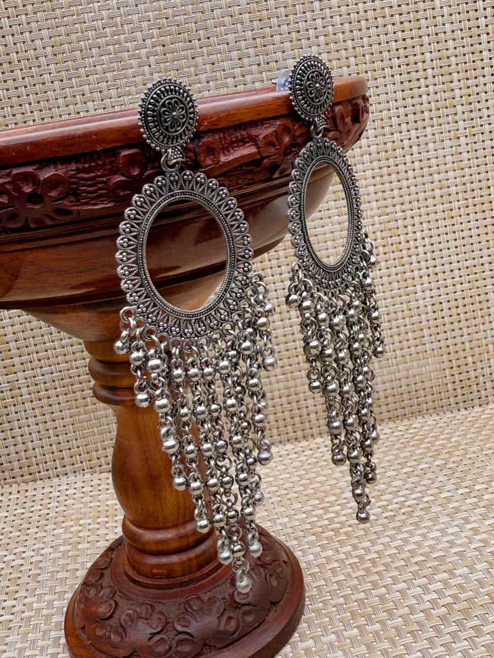 These highly attractive and eye-catching earrings truly capture the essence of Tribal and Bohemian fashion. They feature a rich oxidized silver finish that gives the metal a deep, antique look, which beautifully highlights the intricate detail.