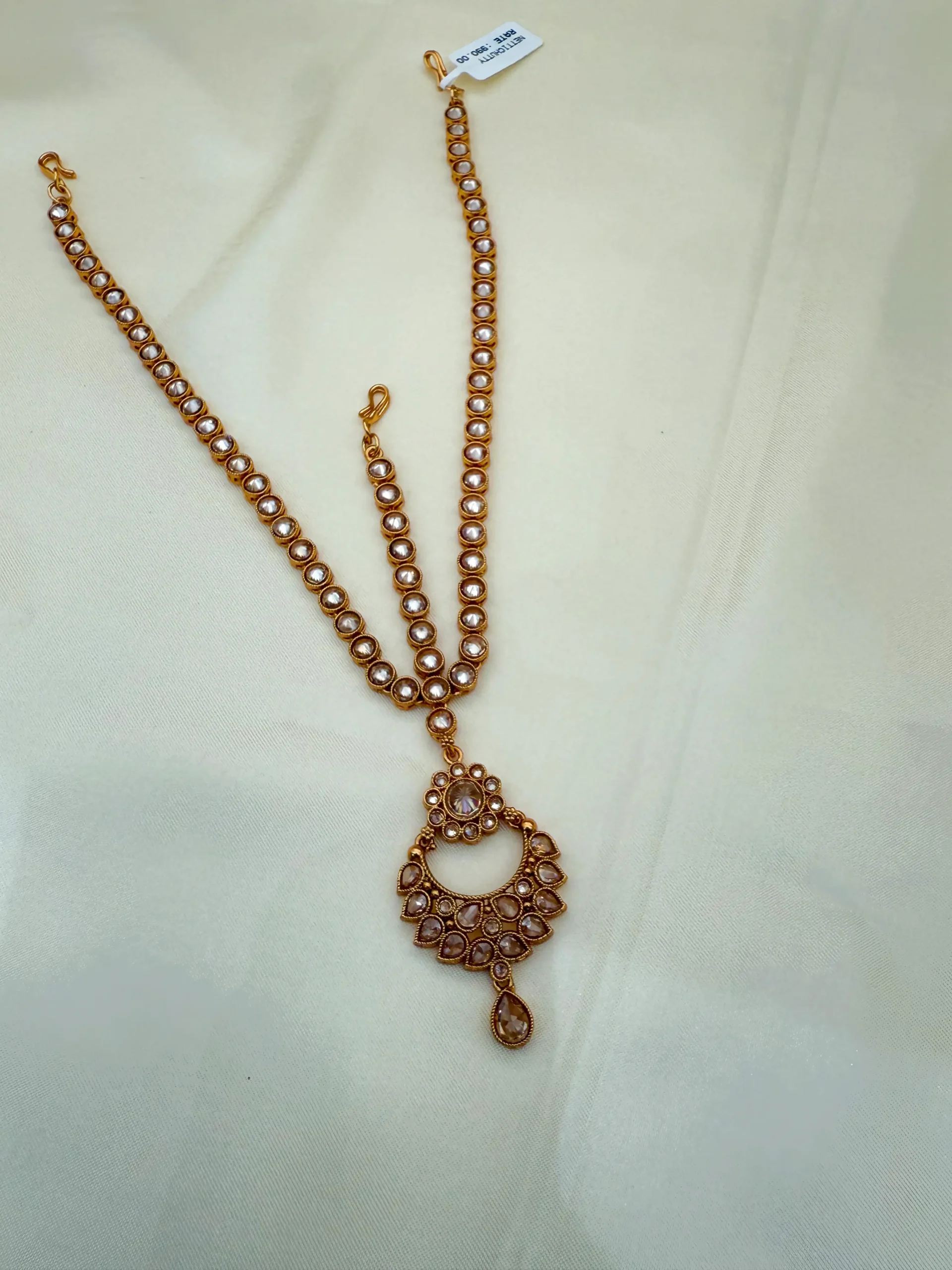 The dazzling Crystal Bridal Tikka features brilliant white crystals set in a sophisticated antique gold covered finish. This elegant three-chain headpiece and crescent pendant is perfect for creating a glamorous bridal look. Crystal Bridal Tikka the perfect blend of traditional elegance and modern sparkle for your wedding or reception.