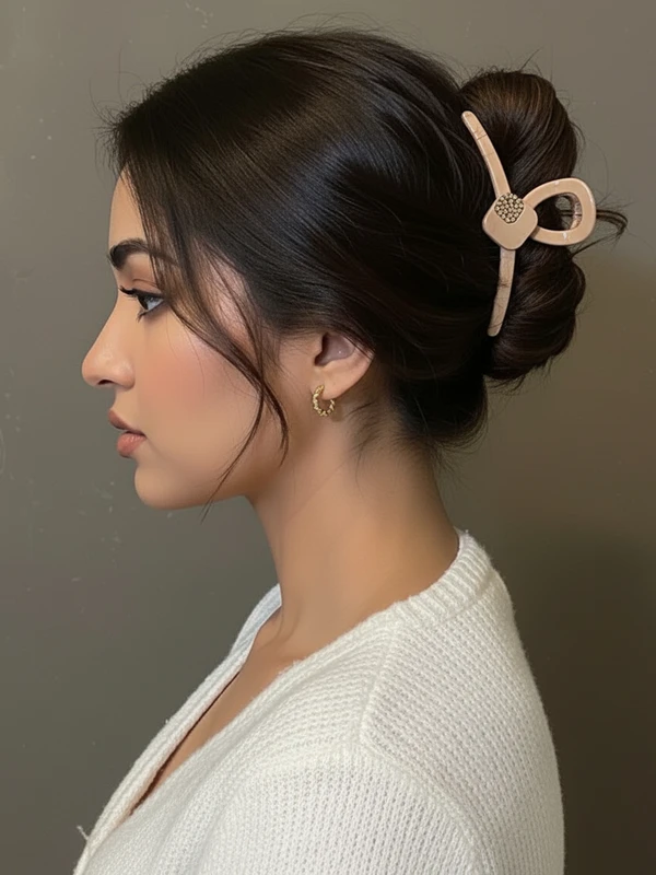 Shop the Chic Resin Hair Claw, a durable plastic hair accessory with pink stones. Ideal for South Indian attire & professional office looks.