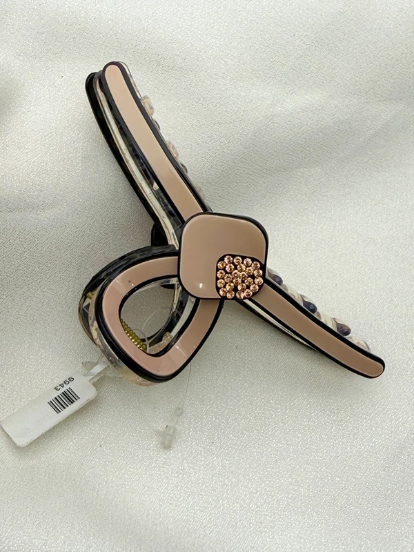 Chic Resin Hair Claw: Durable plastic hair clutcher in blush/brown tones with sparkling pink stones for a secure, stylish hold. This premium hair piece gives you the look of a designer accessory, proving that practical accessories can be effortlessly glamorous.