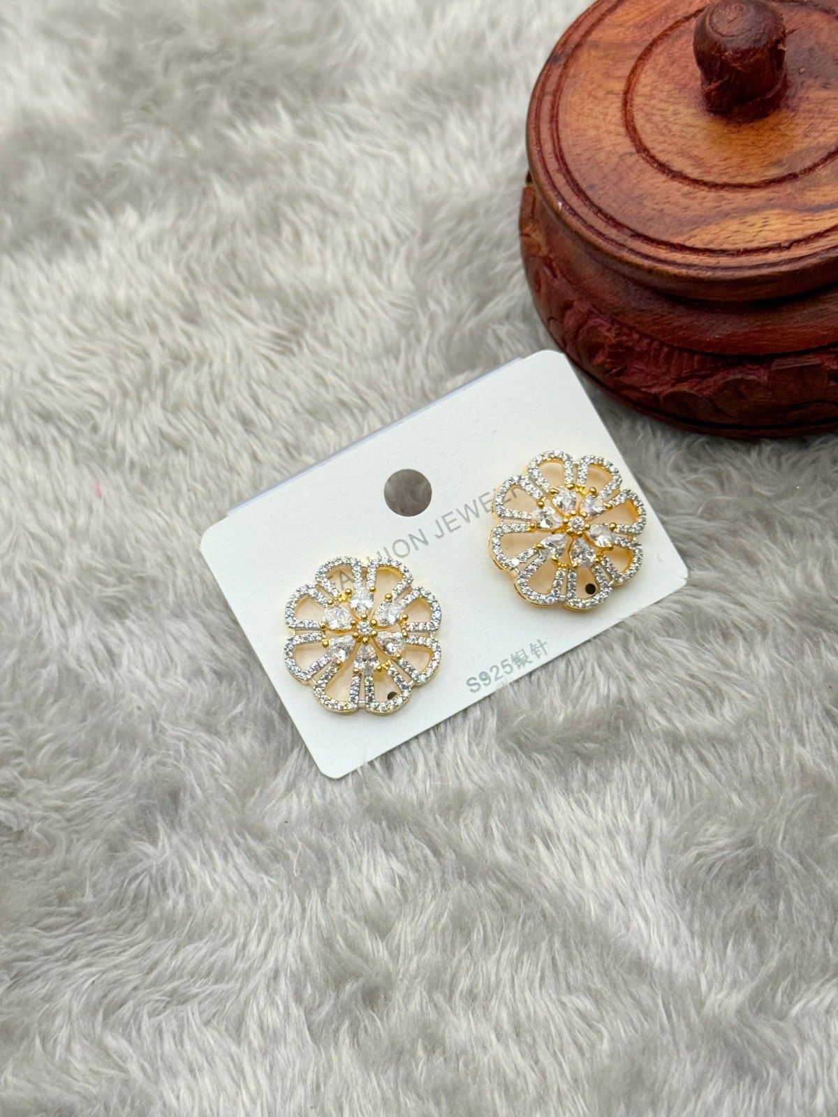 These charming flower studs are crafted in a lustrous Gold Tone, featuring a beautiful openwork floral design. Each petal is finely set with shimmering White Crystal (Cubic Zirconia) stones, creating an attractive and eye-catching sparkle.