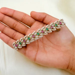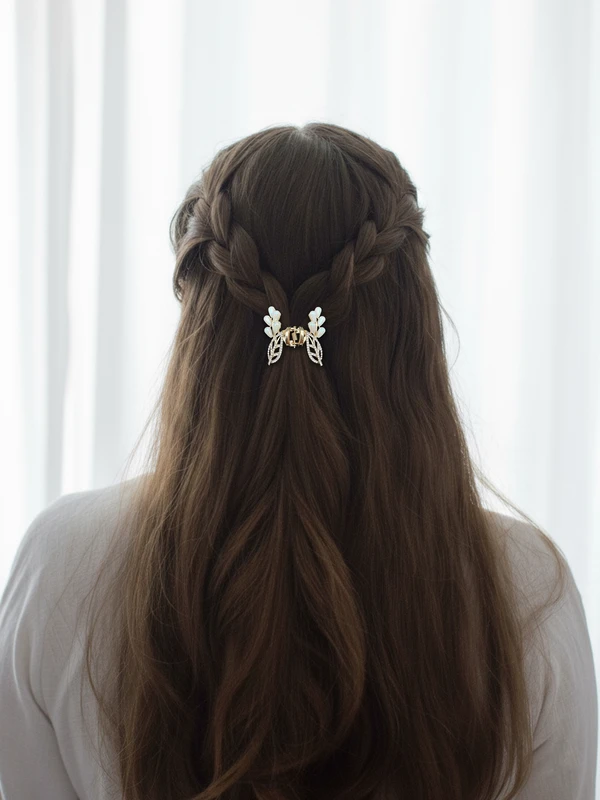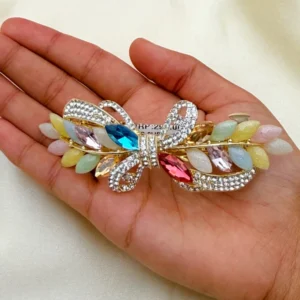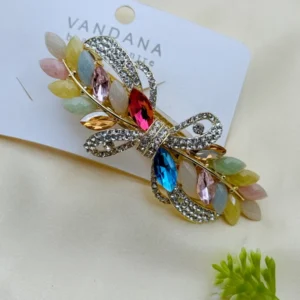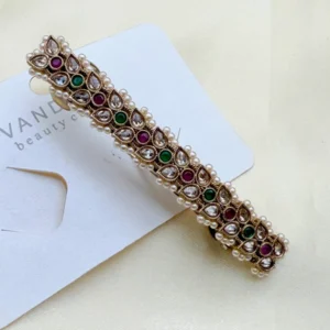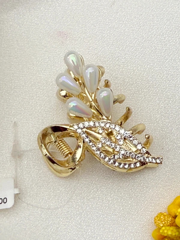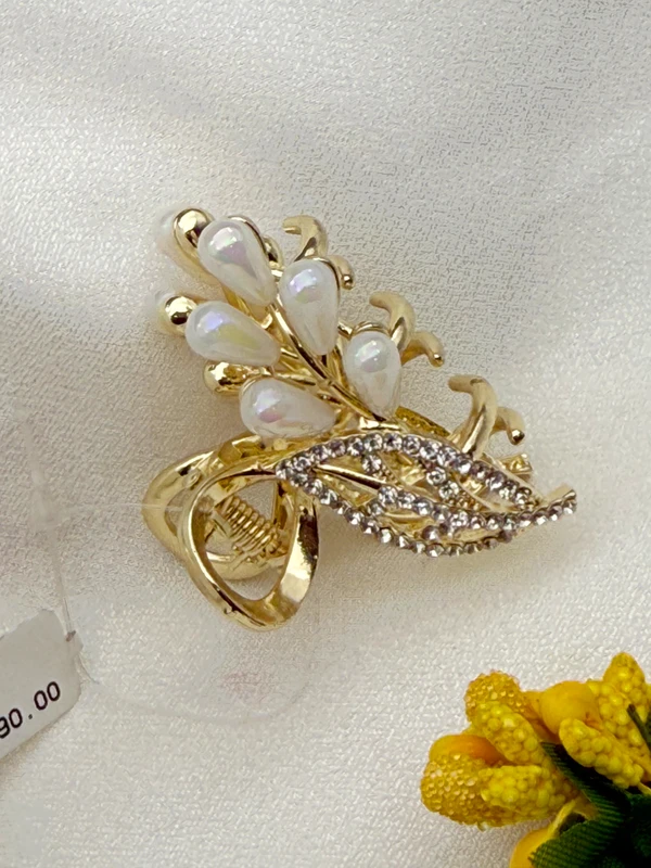 Discover the Dewdrop Vine Hair Clutcher, a premium gold tone metal hair accessory perfect for elegant styling. This designer hair clutcher features a unique flower plant motif adorned with lustrous teardrop pearls. The intricate design includes sparkling crystal stones set on a graceful crystal leaf, enhancing its luxurious appeal.