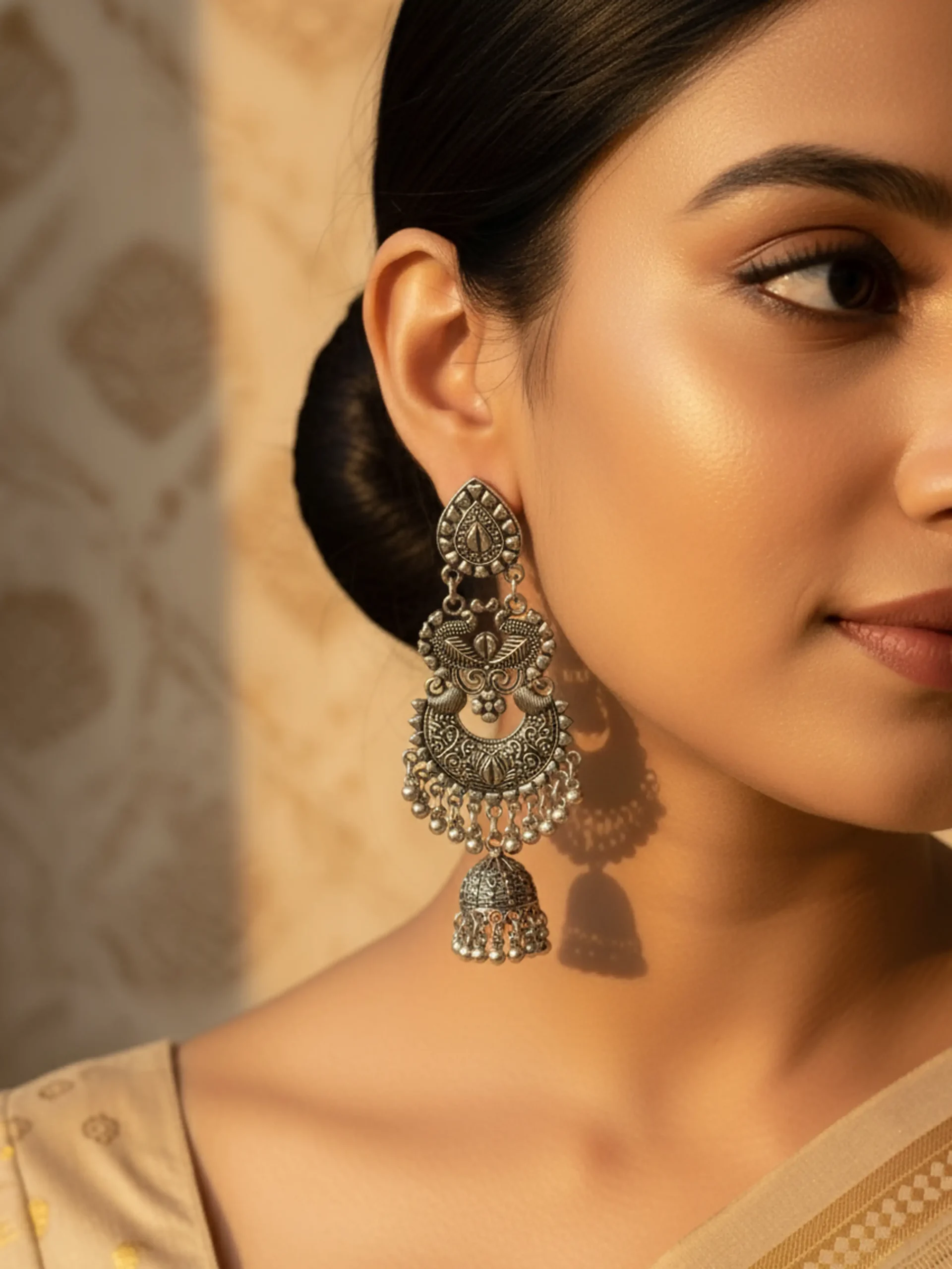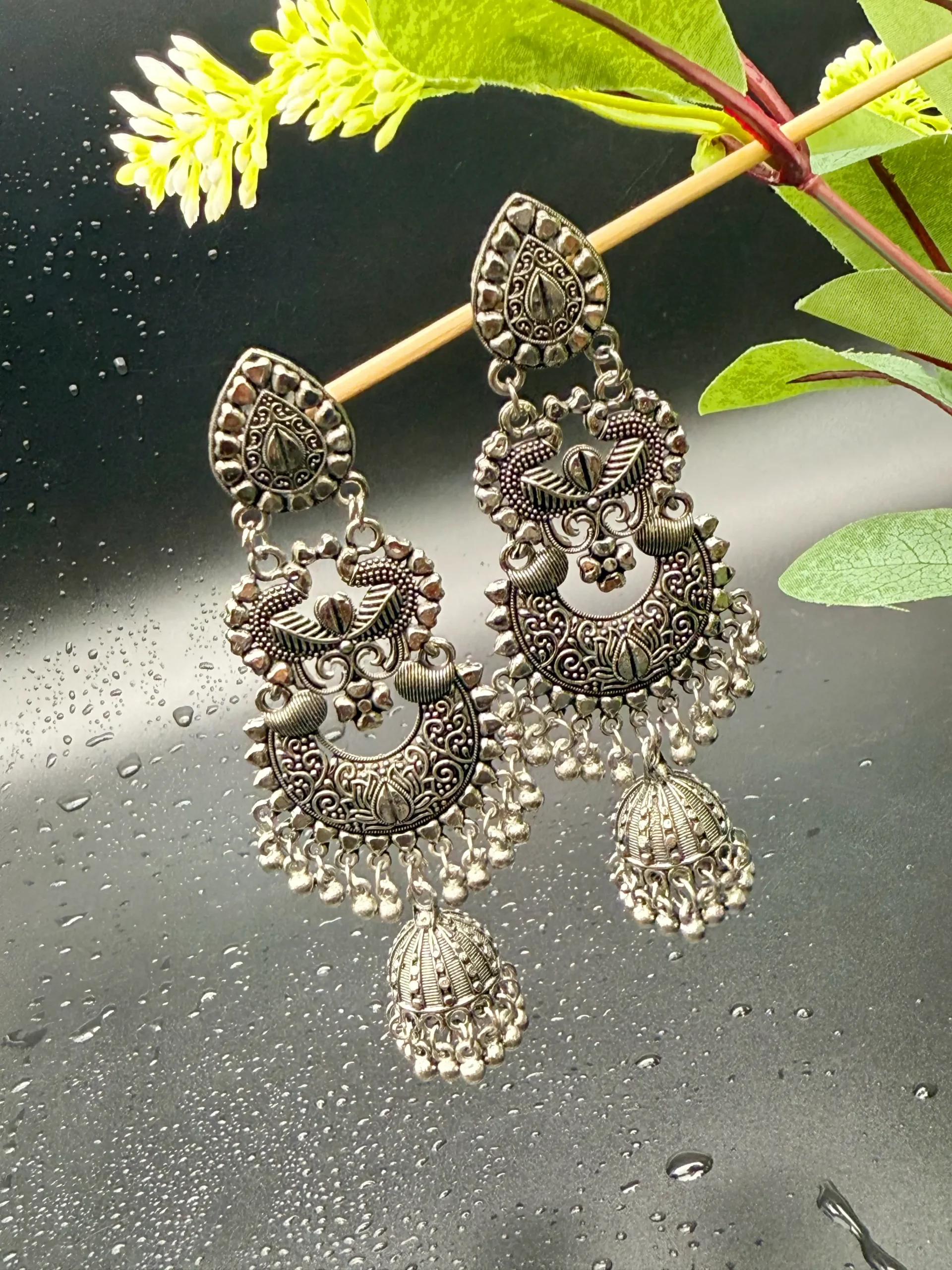 Embrace authentic heritage style with the Jewel Drops, a striking pair of ethnic statement drop earrings. These attractive and eye-catching drops feature a dramatic, multi-tiered design, finished in a rich antique oxidized silver-tone. The metalwork is highly detailed with traditional etched patterns, featuring prominent teardrop and crescent (arch) motifs.