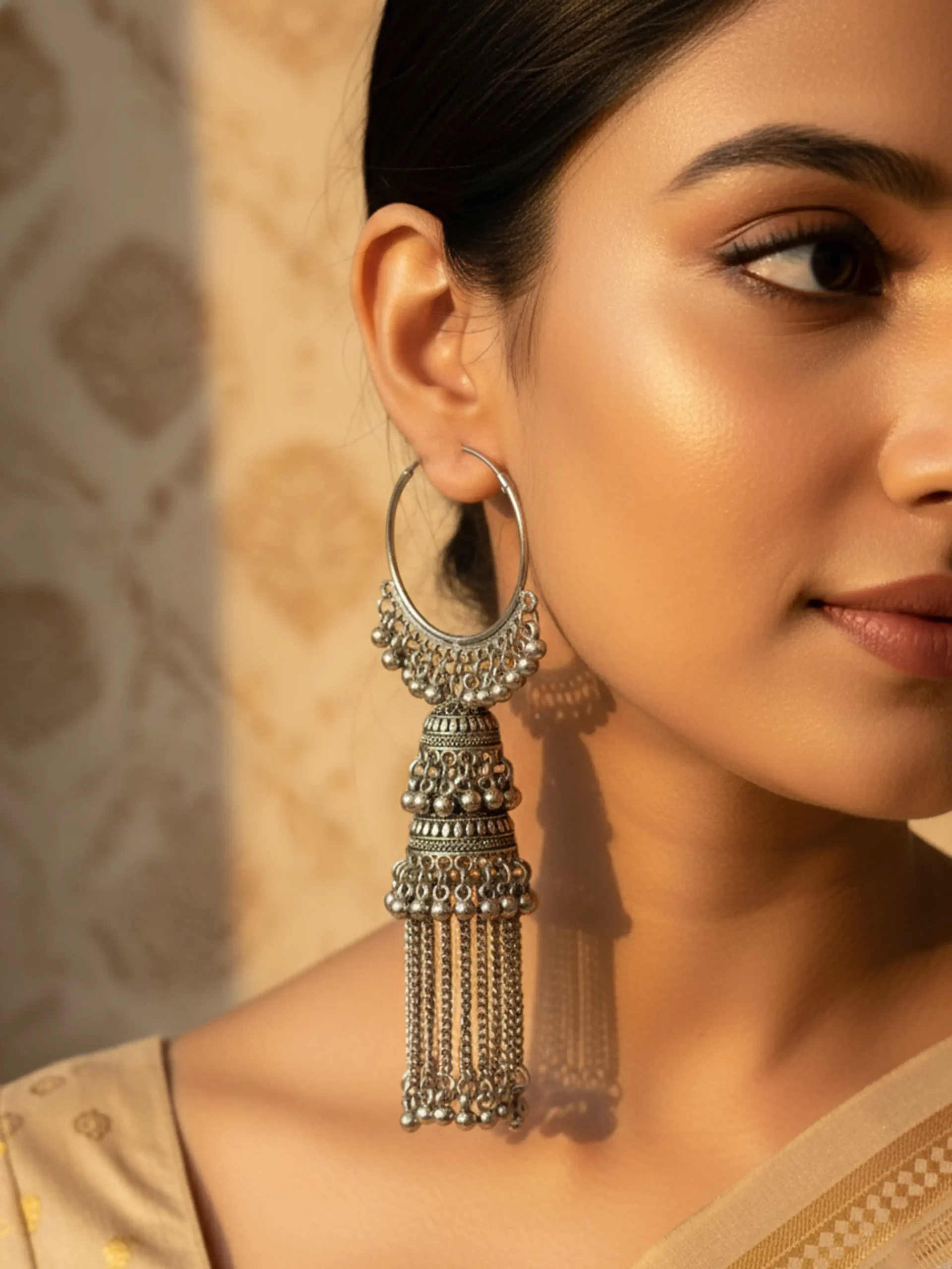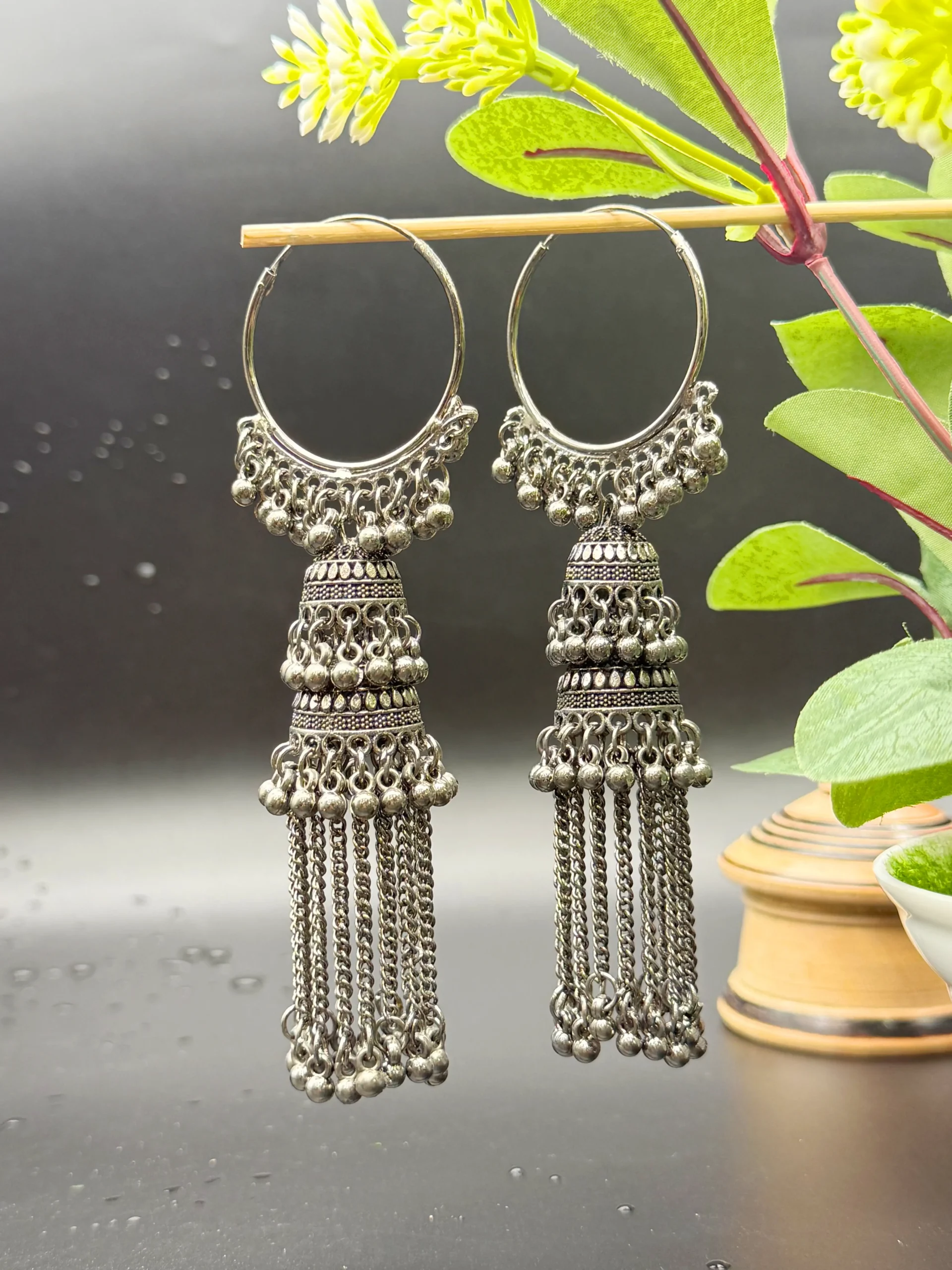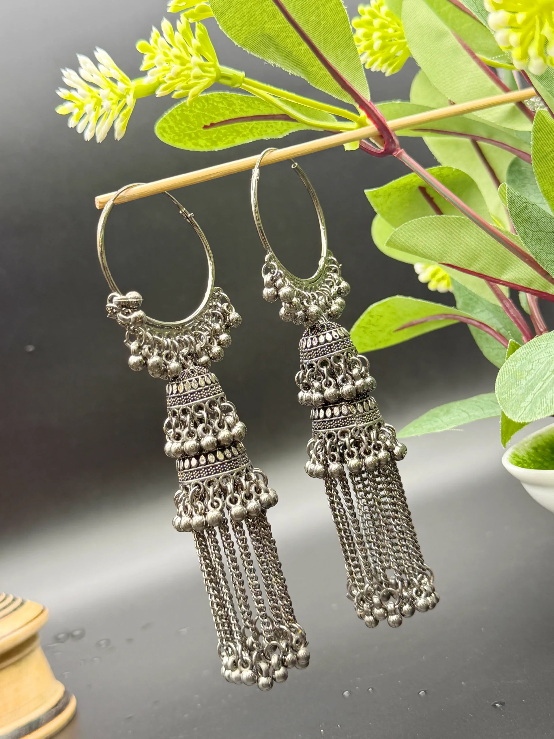 Embrace bohemian flair with The Nomad Tassel Drops, a pair of stunning oxidized silver-tone earrings. These attractive and eye-catching drops feature a classic hoop top, from which a large, tiered Jhumka-style bell is suspended. The entire piece is finished in a beautiful dark, antique silver/pewter tone, giving it a rich, vintage, tribal feel.