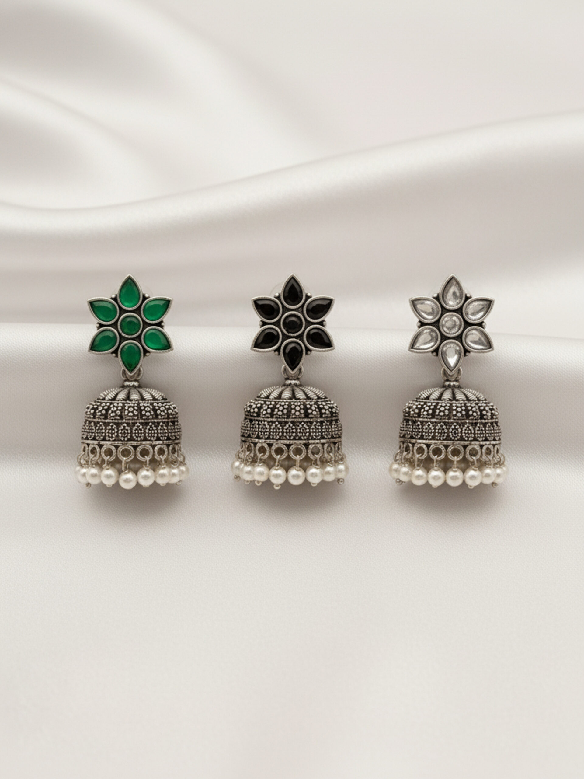 Rule every occasion with this regal 3-pair oxidized silver jhumka combo in lush emerald green, mysterious black, and sparkling crystal—timeless floral elegance that turns heads effortlessly.