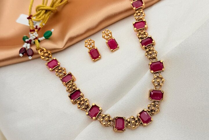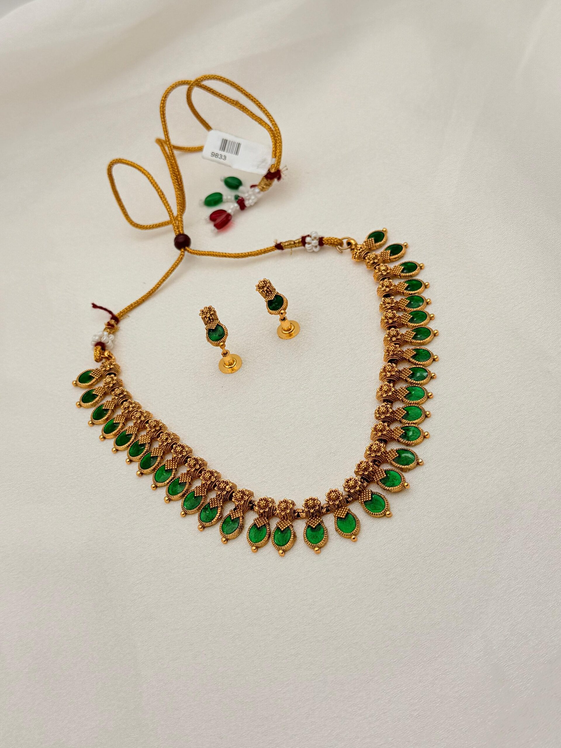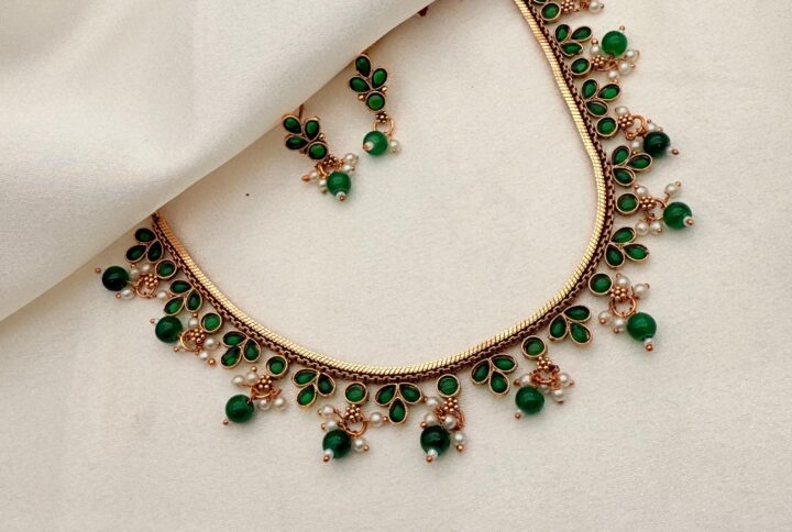 The exquisite gold-plated necklace features a continuous string of shimmering emerald green teardrop stones, each meticulously set to create a graceful, flowing design. Small, brilliant white accents highlight the intricate detailing, adding a touch of sparkle. The comfortable design sits elegantly around the neckline, making it versatile for various styles
