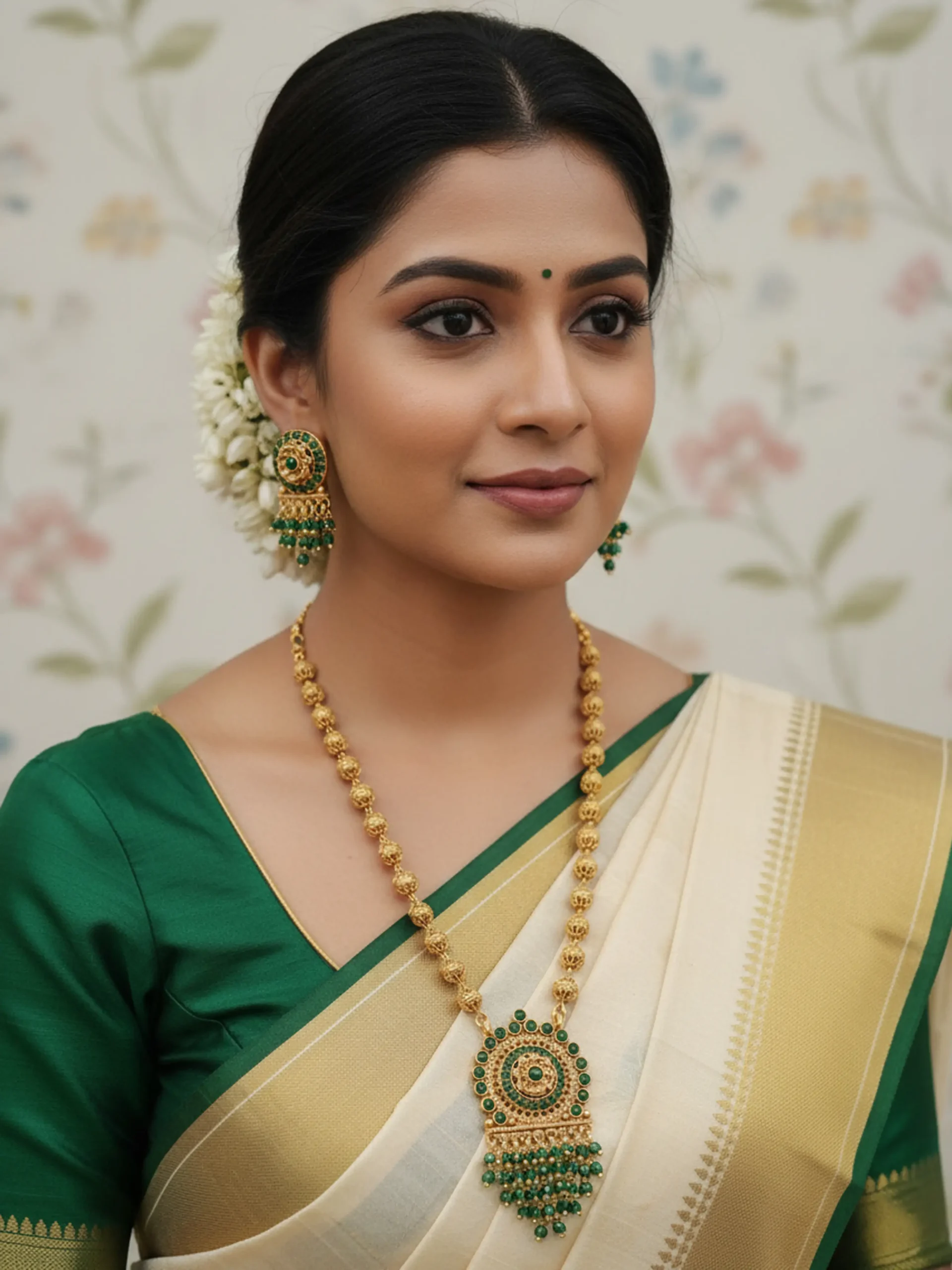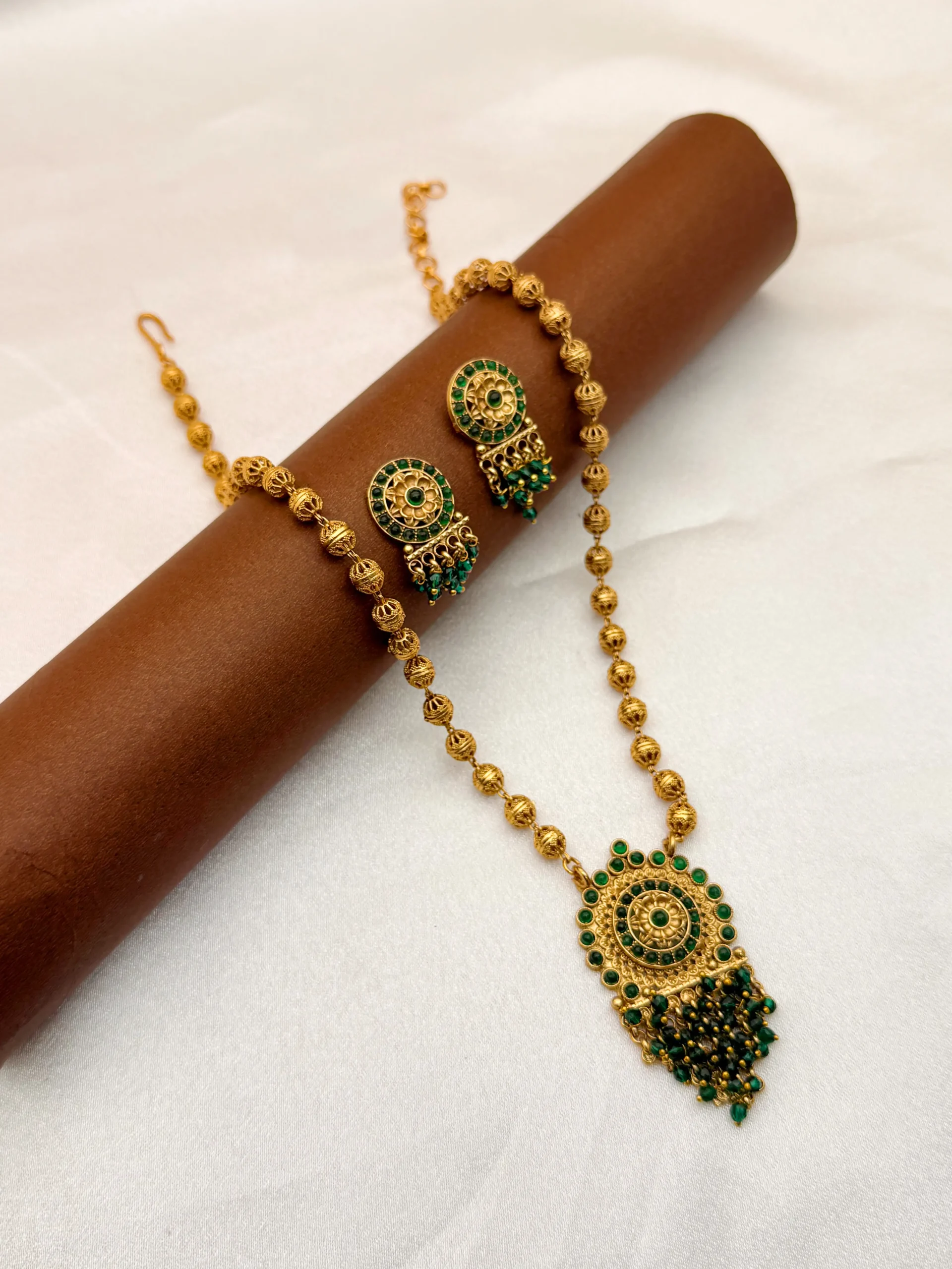 Secure this magnificent Emerald Antique Long Haram Set! A traditional South Indian piece featuring a grand circular temple pendant and brilliant, faceted green emerald stones. This is the ultimate heirloom-quality statement necklace, complete with matching Earrings. this chance to own a piece of true traditional splendor.