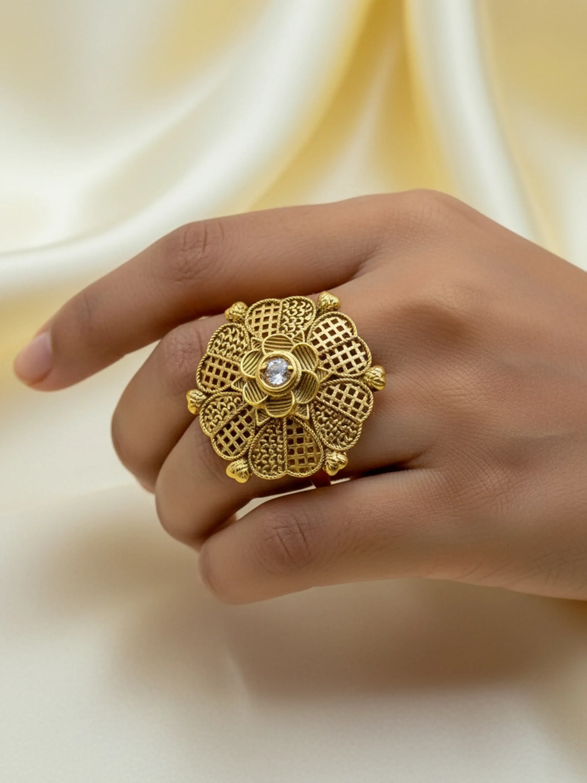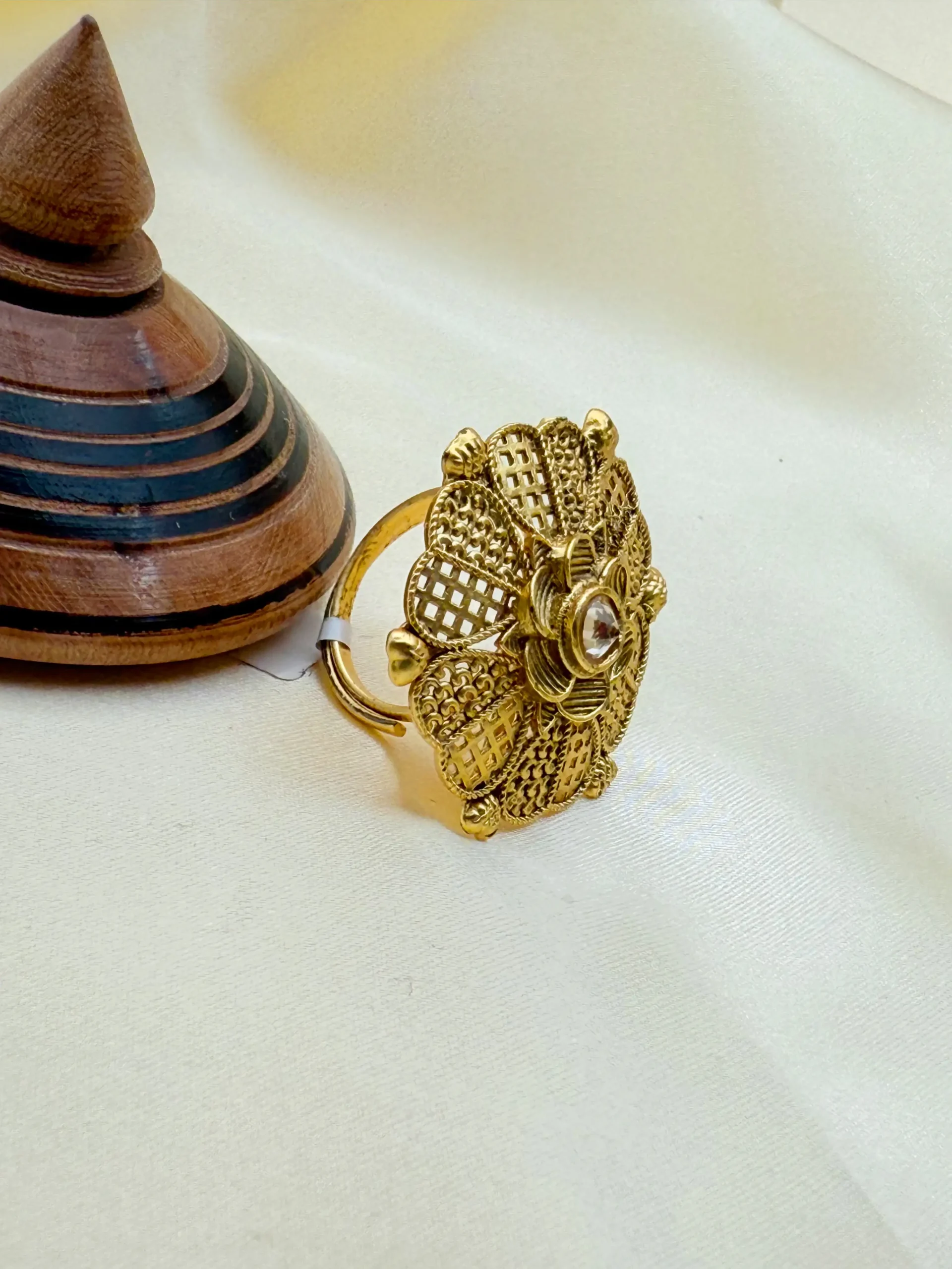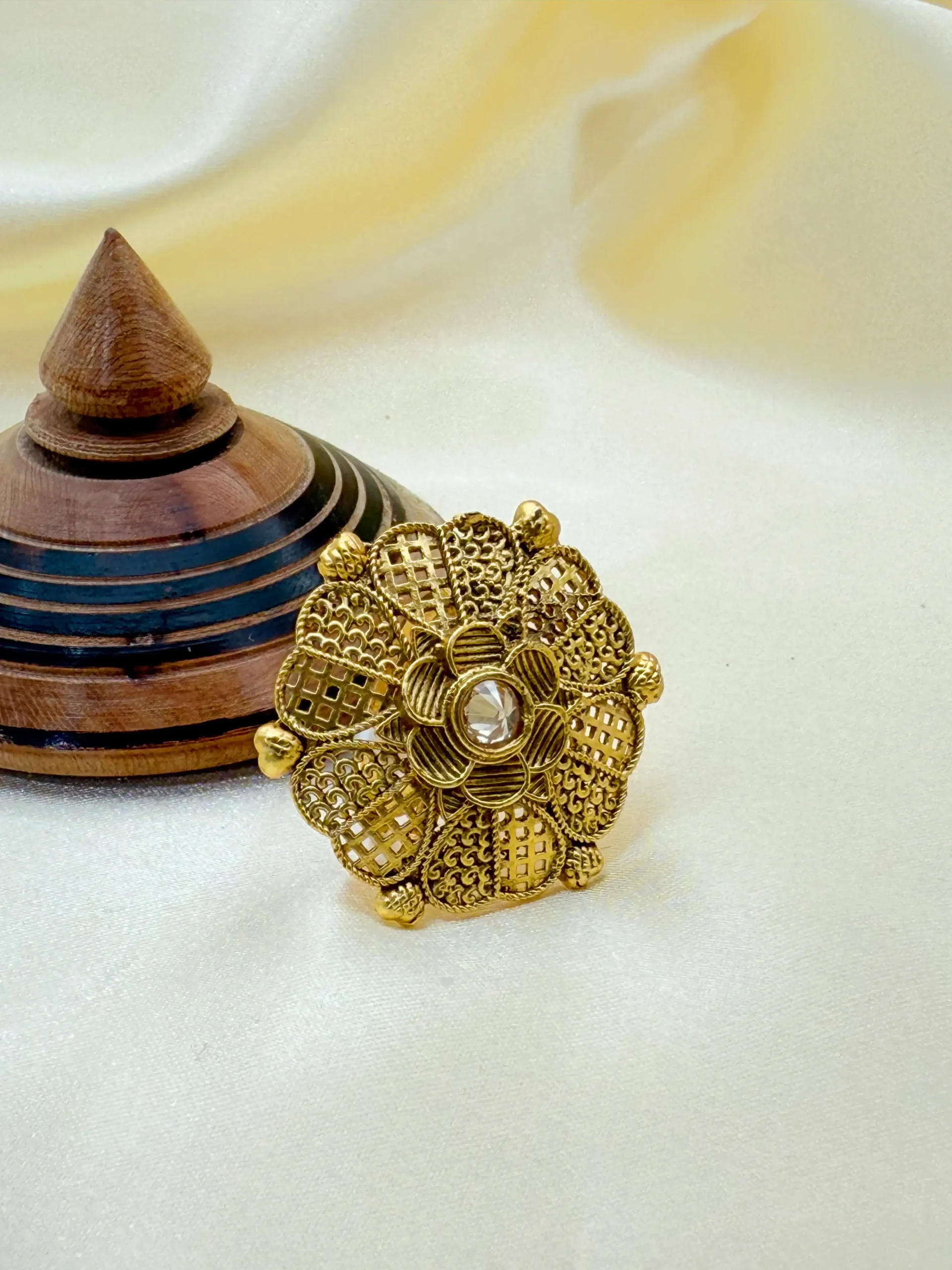 This Antique Filigree Ring is a stunning statement piece, featuring intricate filigree and textured metalwork that gives it a rich, vintage appeal. The ornate floral design is beautifully centered with a sparkling clear gemstone. The deep antique gold-tone finish is ideal for enhancing traditional and ethnic ensembles.