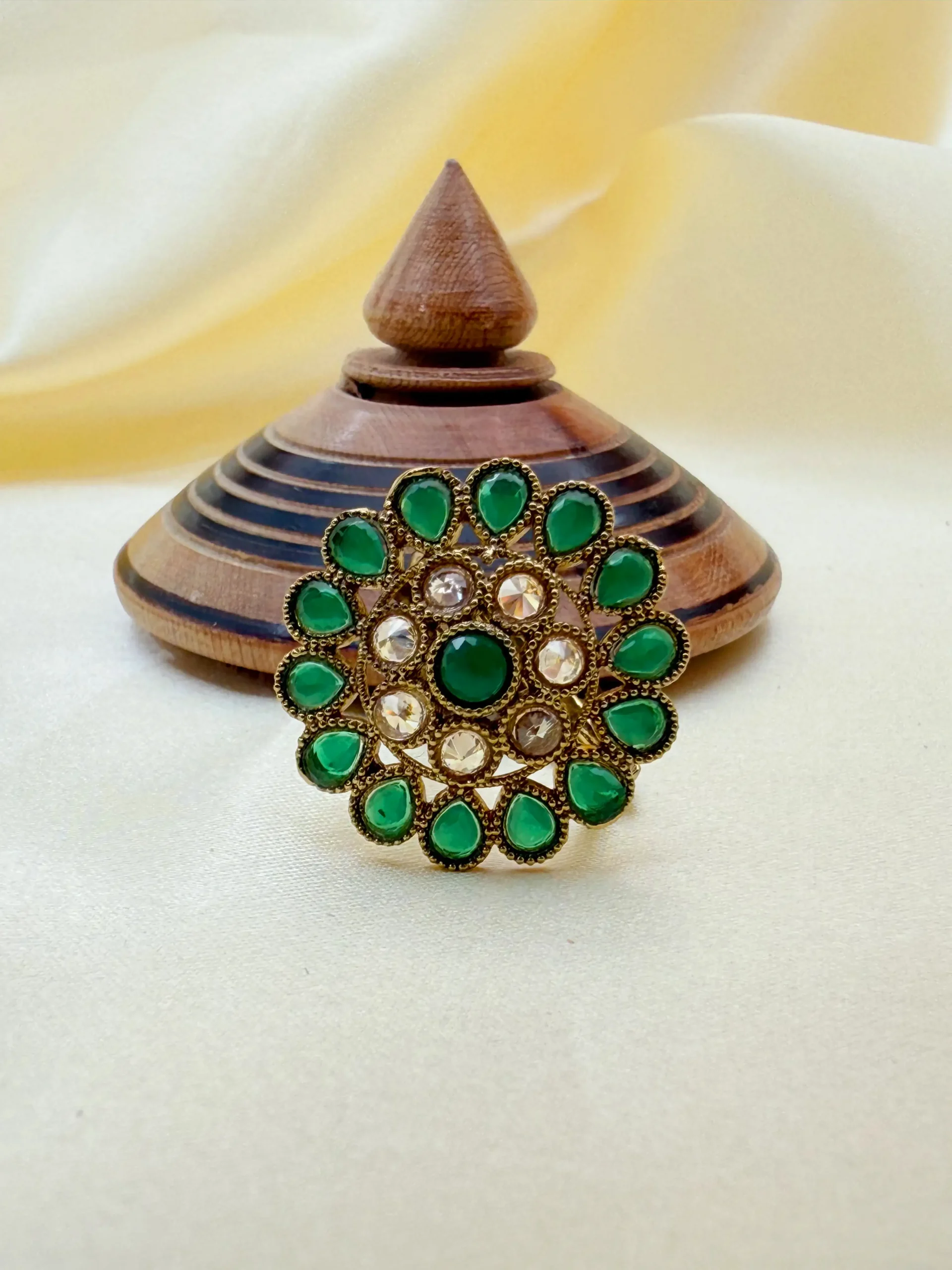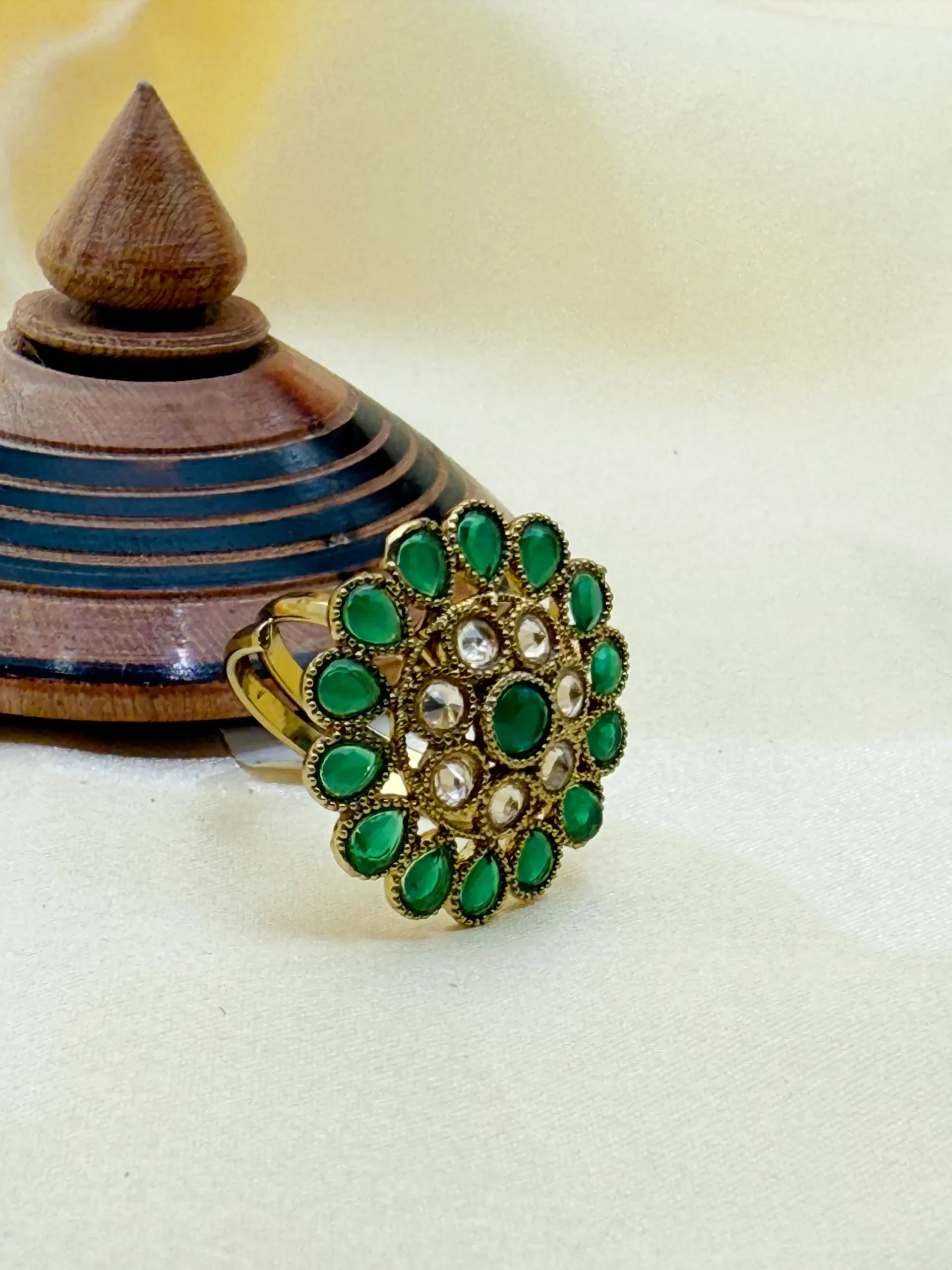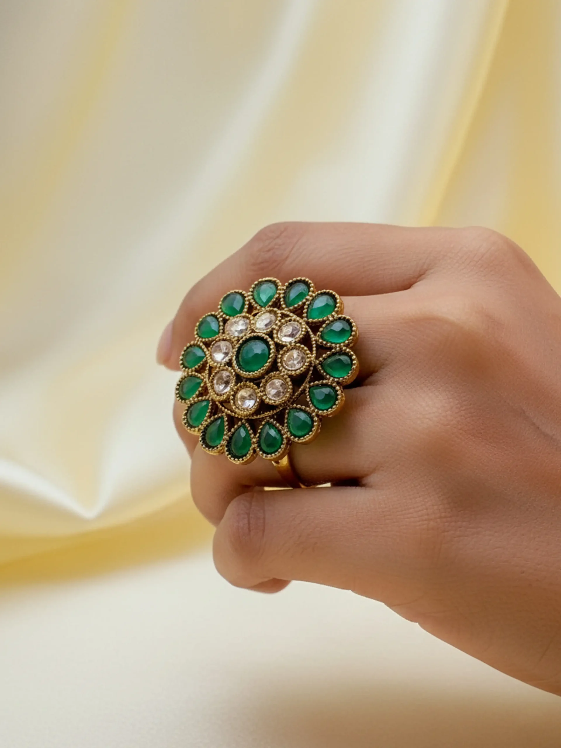 Elevate your ethnic elegance with the Emerald Bloom Finger Ring, a masterpiece crafted with radiant green stones and a luxurious gold-plated finish. The floral design captures timeless charm and sophistication, making it perfect for festive occasions, weddings, and everyday royal style. Adjustable fit ensures comfort and versatility for all hand sizes.