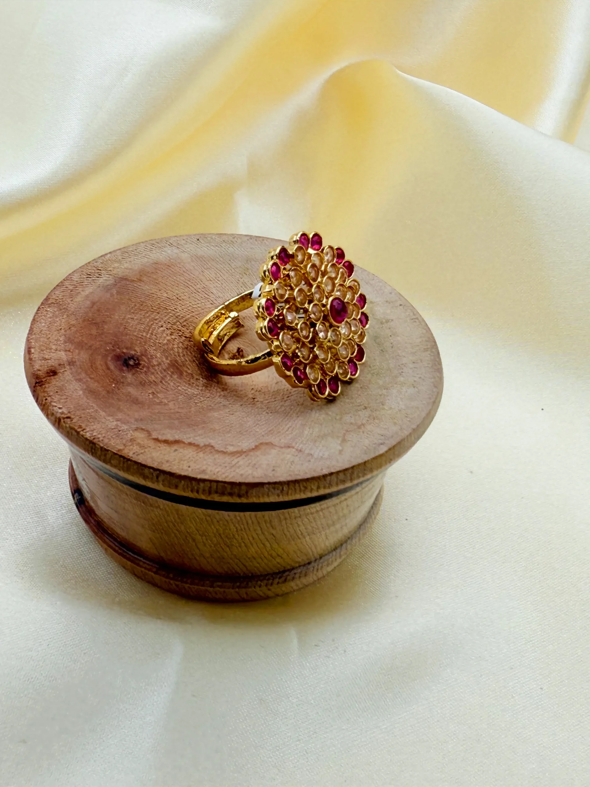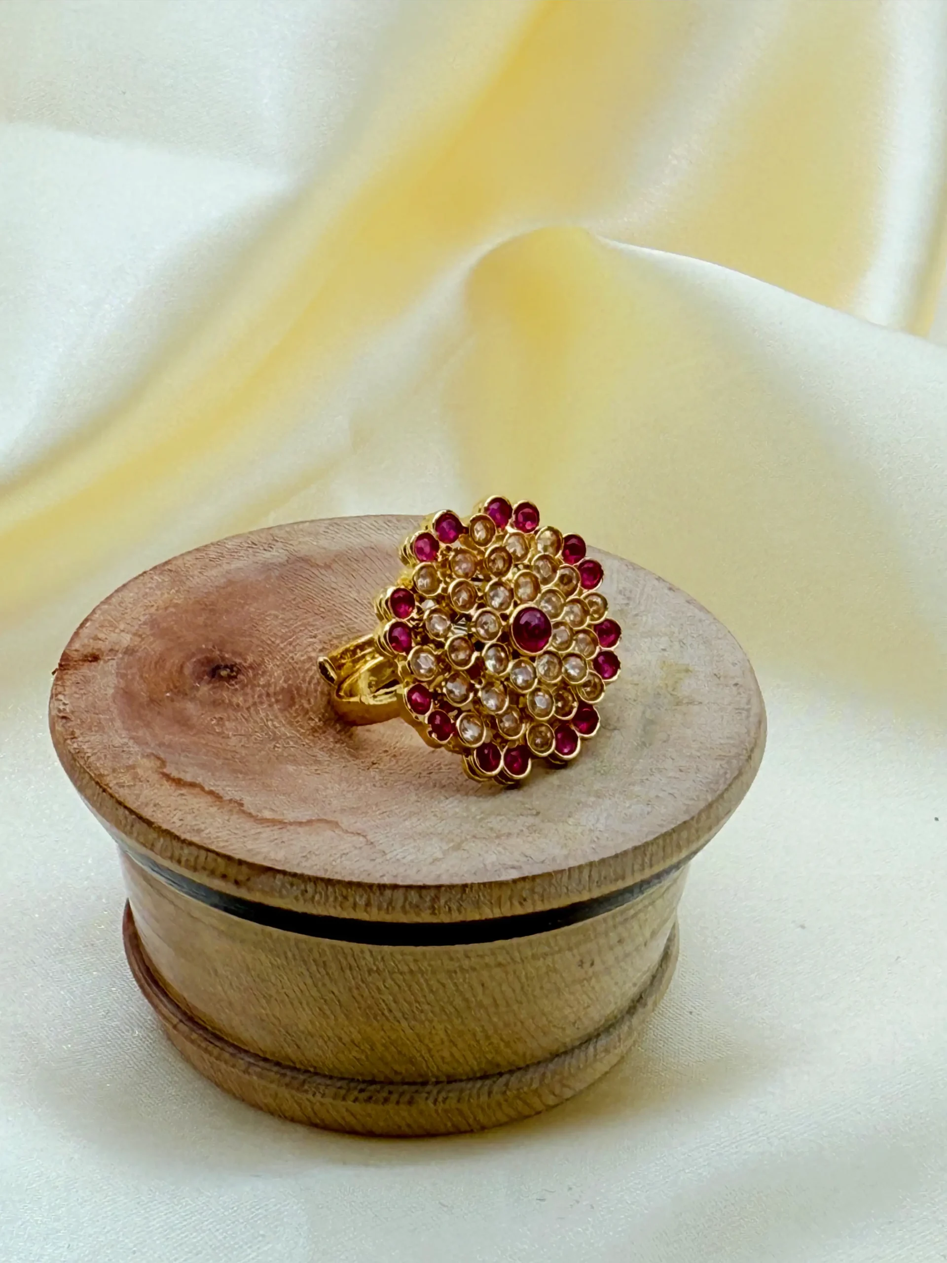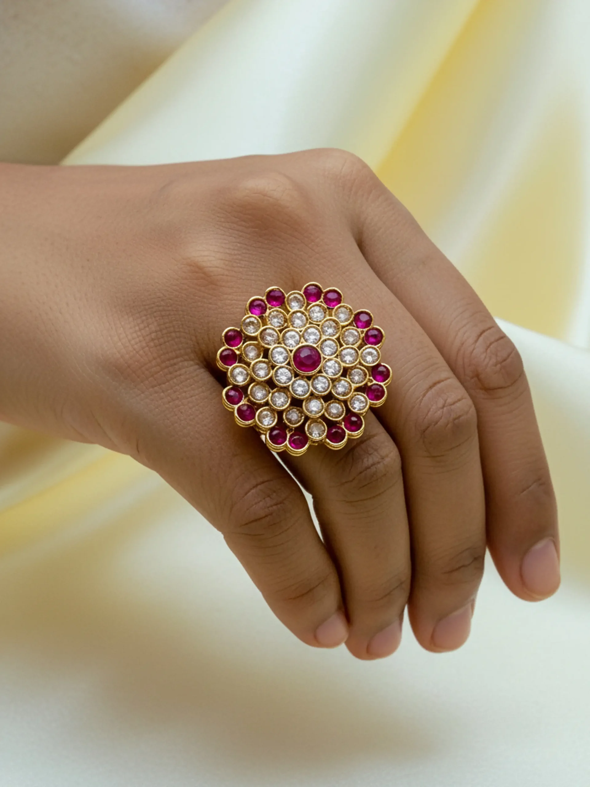 Make a royal entrance with this opulent Traditional Ruby Ring. This luxurious piece captures the essence of heritage jewelry, featuring a bold gold-tone setting that beautifully enhances the stones.