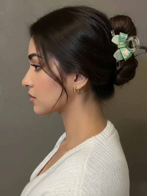 Glint Claw: Dazzling glitter green hair clutcher with iridescent finish. Secure and stylish for all occasions. Perfect for adding a festive touch to traditional Indian attire or a pop of color to modern ensembles, this designer hair claw is a versatile statement piece. Elevate your everyday style or complete your special occasion look with this beautiful green hair accessory.