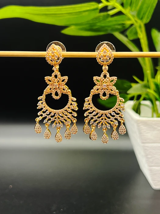 Shine with refined elegance in these beautiful gold-tone AD drop earrings – your perfect statement piece for unforgettable sparkle and grace!