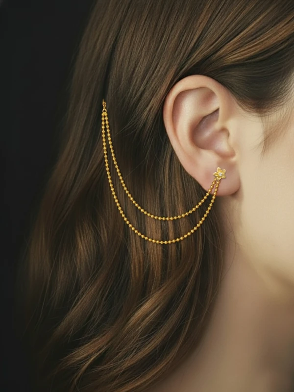 Elegant double-strand Gold-Tone Ear Chain featuring a delicate bead-chain design. Provides support and adds a subtle, classic shimmer to any earring style. Perfect for traditional and contemporary looks. The lightweight design ensures comfort, making this classic Beaded Ear Chain an effortless addition to any jewelry collection.