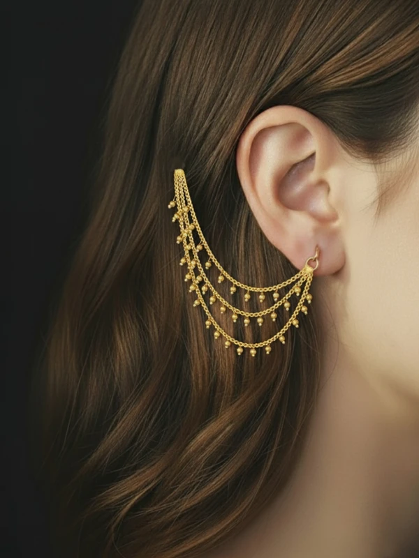Luminous three-line Gold Tone Ear Chain featuring a dense cascade of delicate gold-tone beads. Offers elegant support and adds a rich, traditional texture to any earring, creating a striking visual drape.