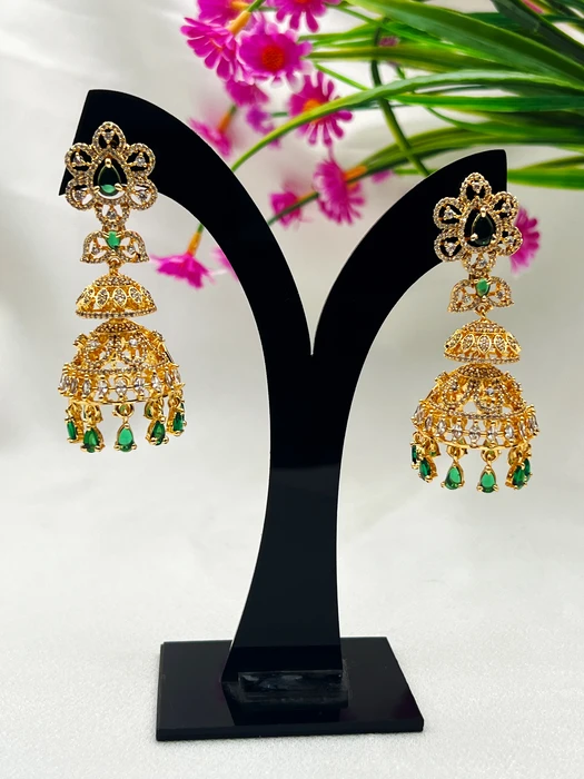 Steal every heart and every spotlight with these majestic gold-tone emerald AD jhumka earrings – your crowning glory for unforgettable ethnic luxury!