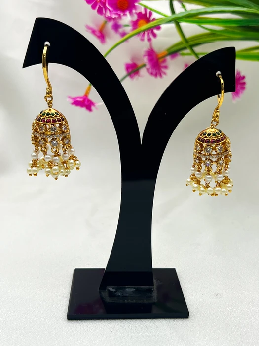 Embrace timeless grace and gentle luxury with these beautiful gold-tone pearl bead jhumka earrings – your signature for elegant ethnic sophistication!