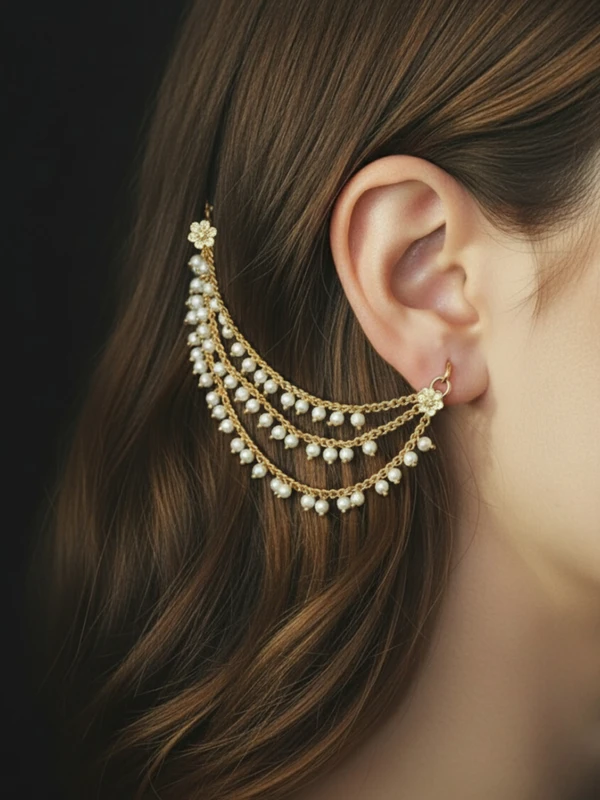 Opulent three-line Gold Tone Ear Chain featuring dangling white pearls for a rich, cascading effect. Provides excellent support for heavy earrings while adding a stunning layer of traditional elegance. This piece is the definition of timeless ethnic glamour and is a must-have for completing your traditional ensemble.