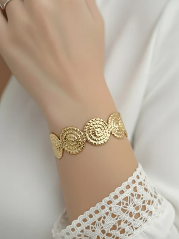 Stunning gold-tone textured swirl cuff bangle with rope-like spiral discs. Bold shine and rich detail for instant luxury.