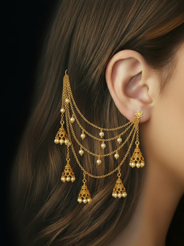 Exquisite three-line Gold Tone Ear Chain adorned with pearl beads and charming jhumka drops. Creates a magnificent, festive drape, offering elegant support for heavy earrings and enhancing any traditional look.