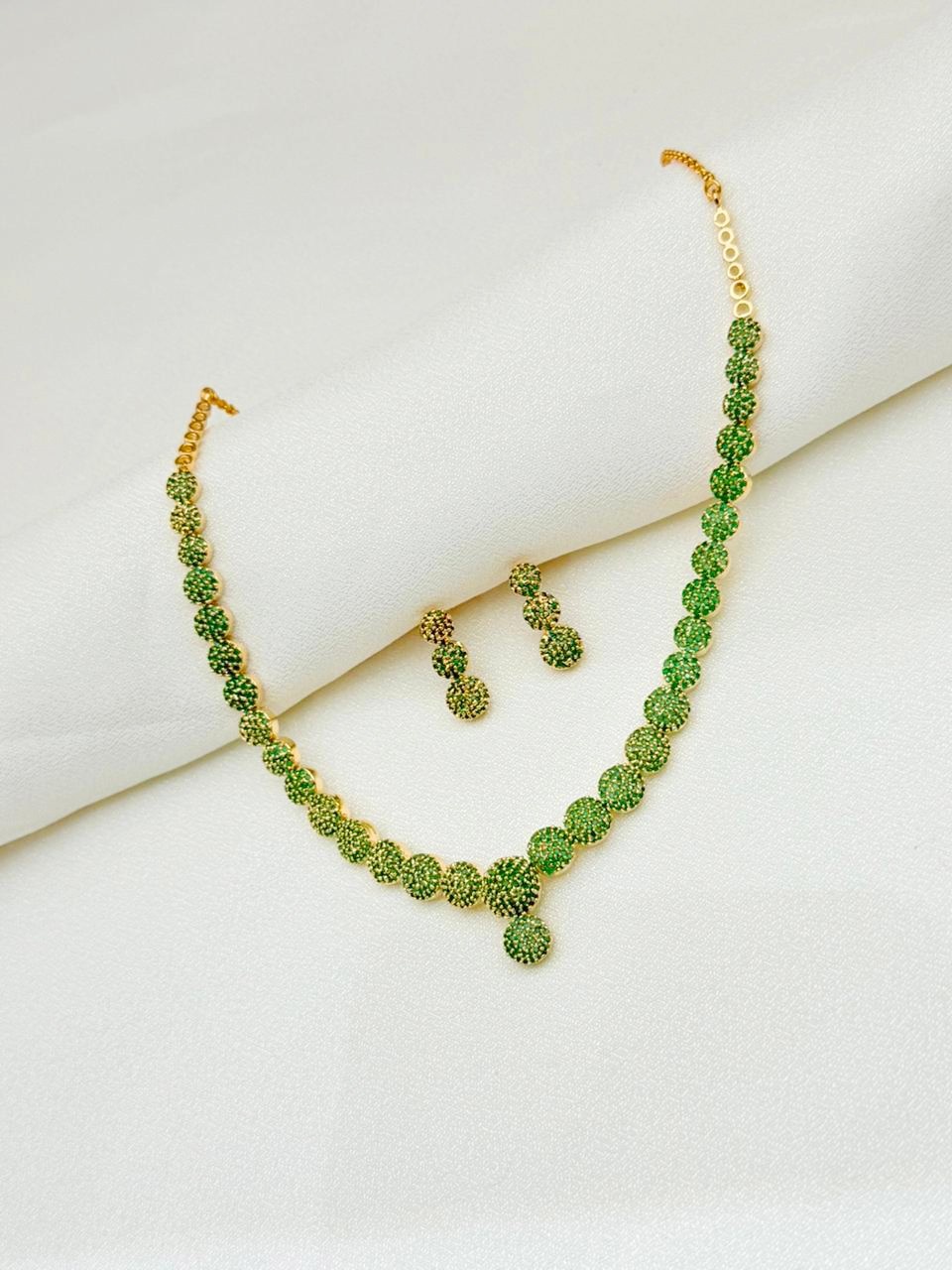 This exquisite jewelry set embodies modern, high-wattage glamour, featuring a brilliant rich gold-plated finish entirely adorned with intensely sparkling green stones. Designed to be a showstopper, this piece offers a luxurious and commanding statement, instantly upgrading any outfit to gala-level sophistication.