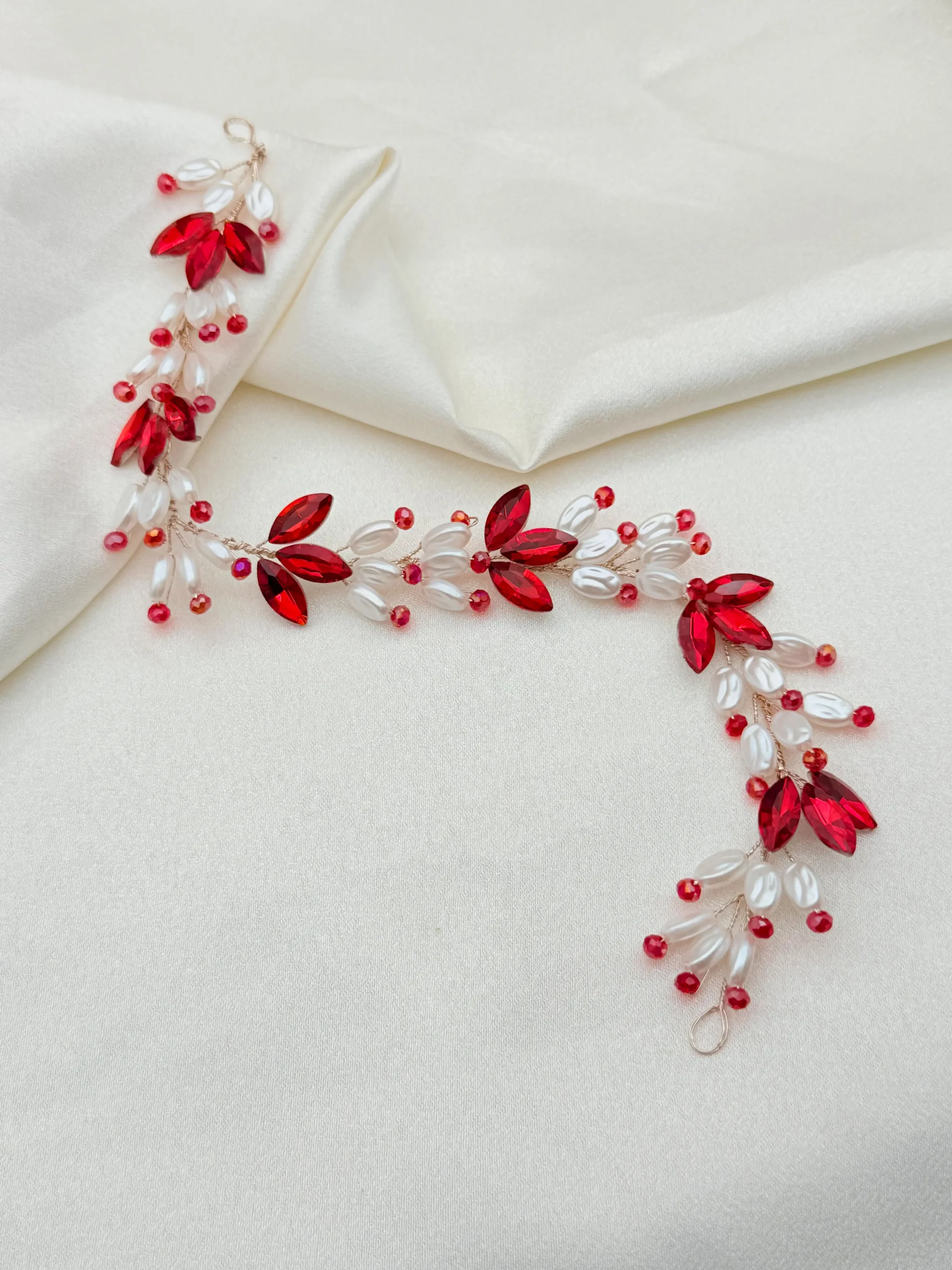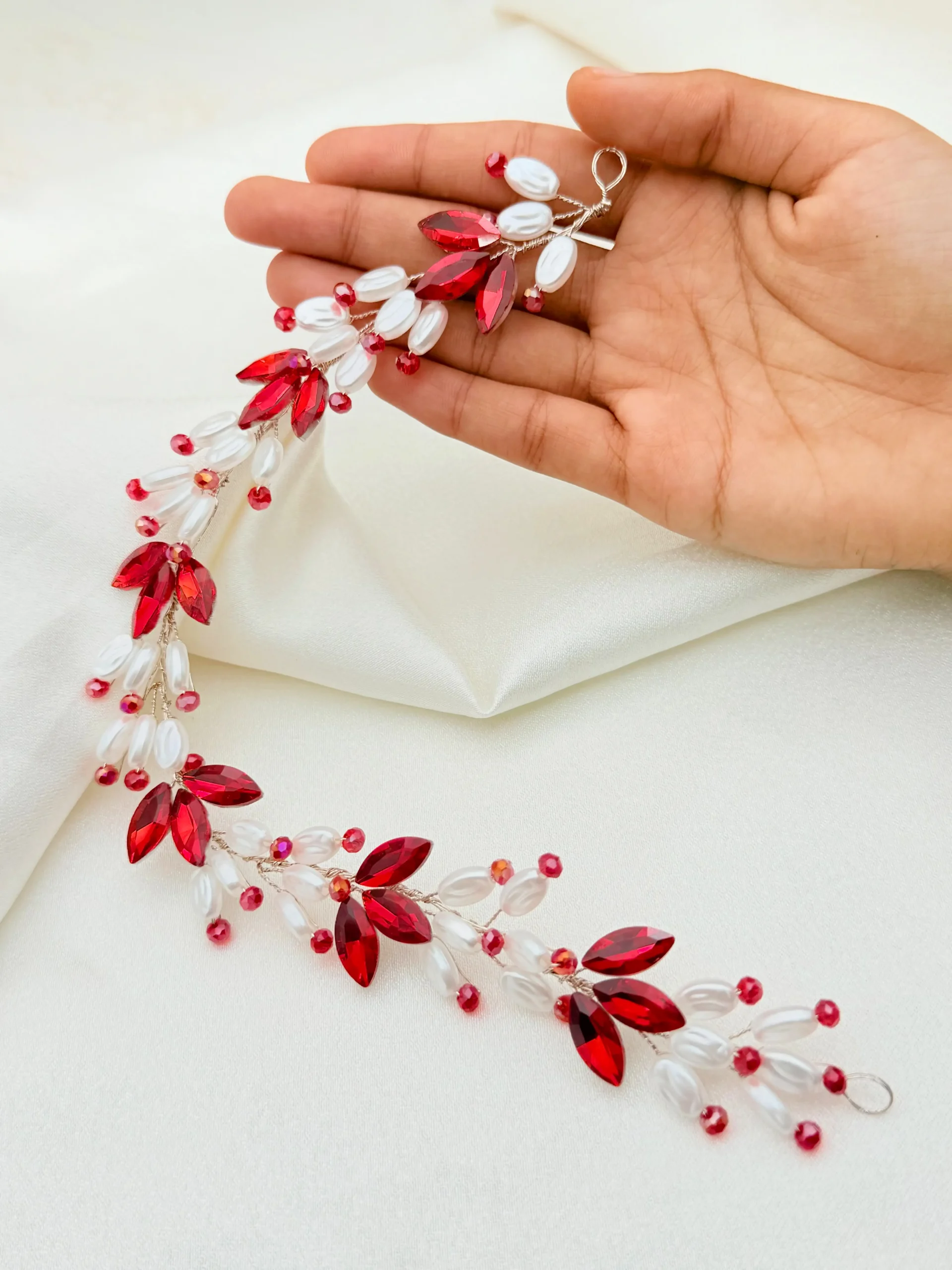 HAIR DECORATION: Bridal Red Crystal & Pearl Hair Vine