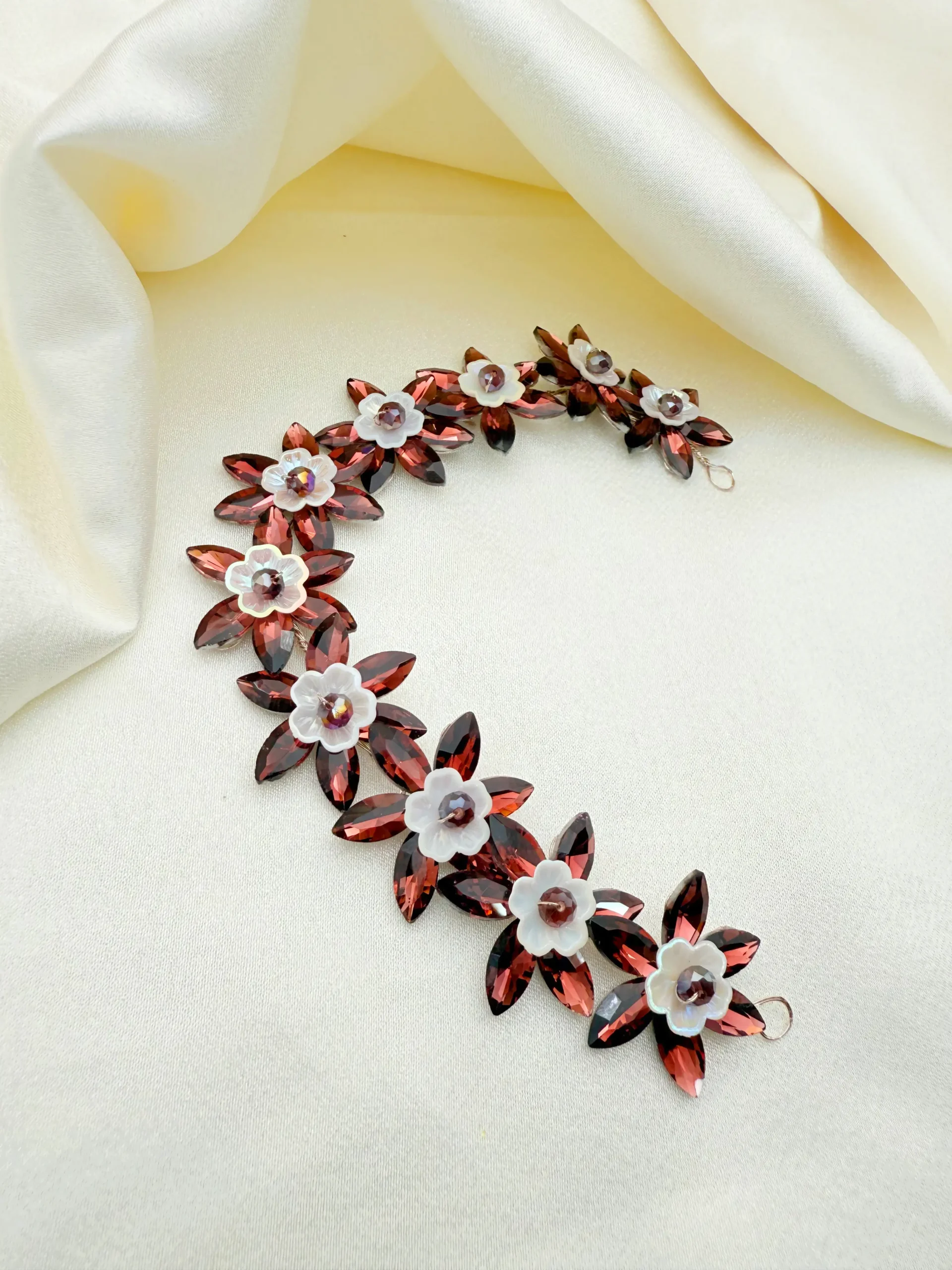 Make a sophisticated statement with this beautifully linked Maroon Crystal Flower Hair Vine. This unique headpiece is composed of striking blossoms, each crafted from rich, deep maroon or burgundy marquise-cut crystals arranged