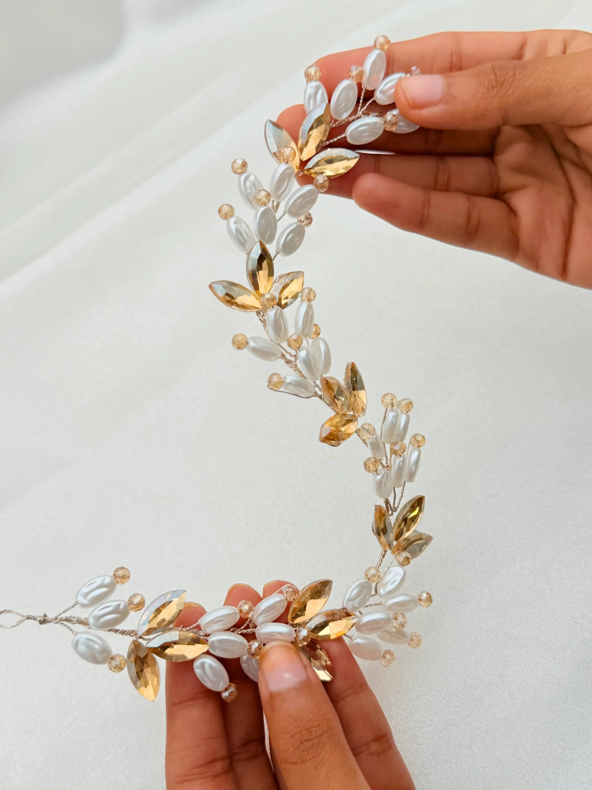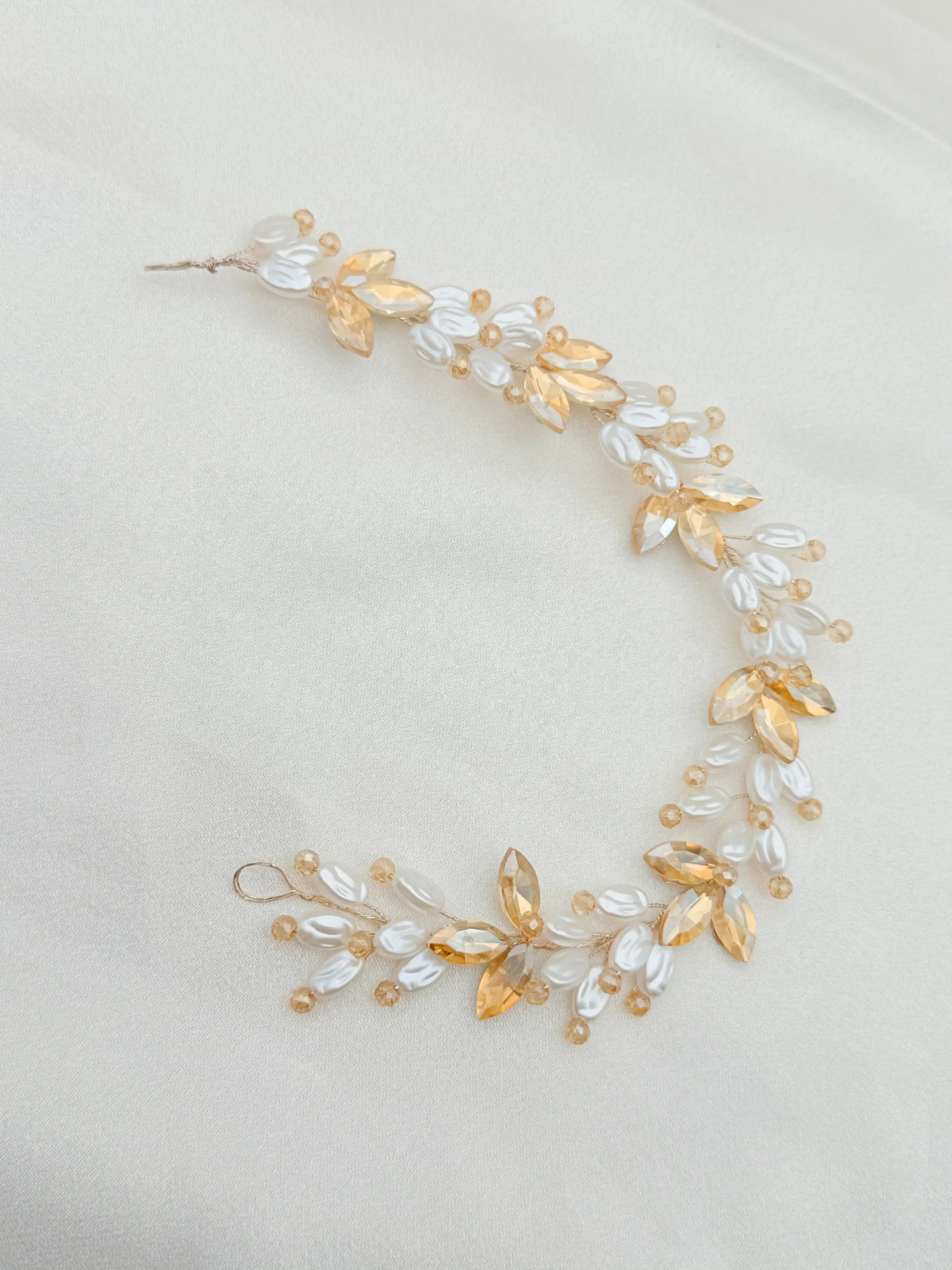 Adorn your special occasion hairstyle with this ethereal Gold Crystal and Pearl Leaf Bridal Hair Vine. This piece is exquisitely handcrafted on a flexible gold-tone wire, allowing for endless styling possibilities,