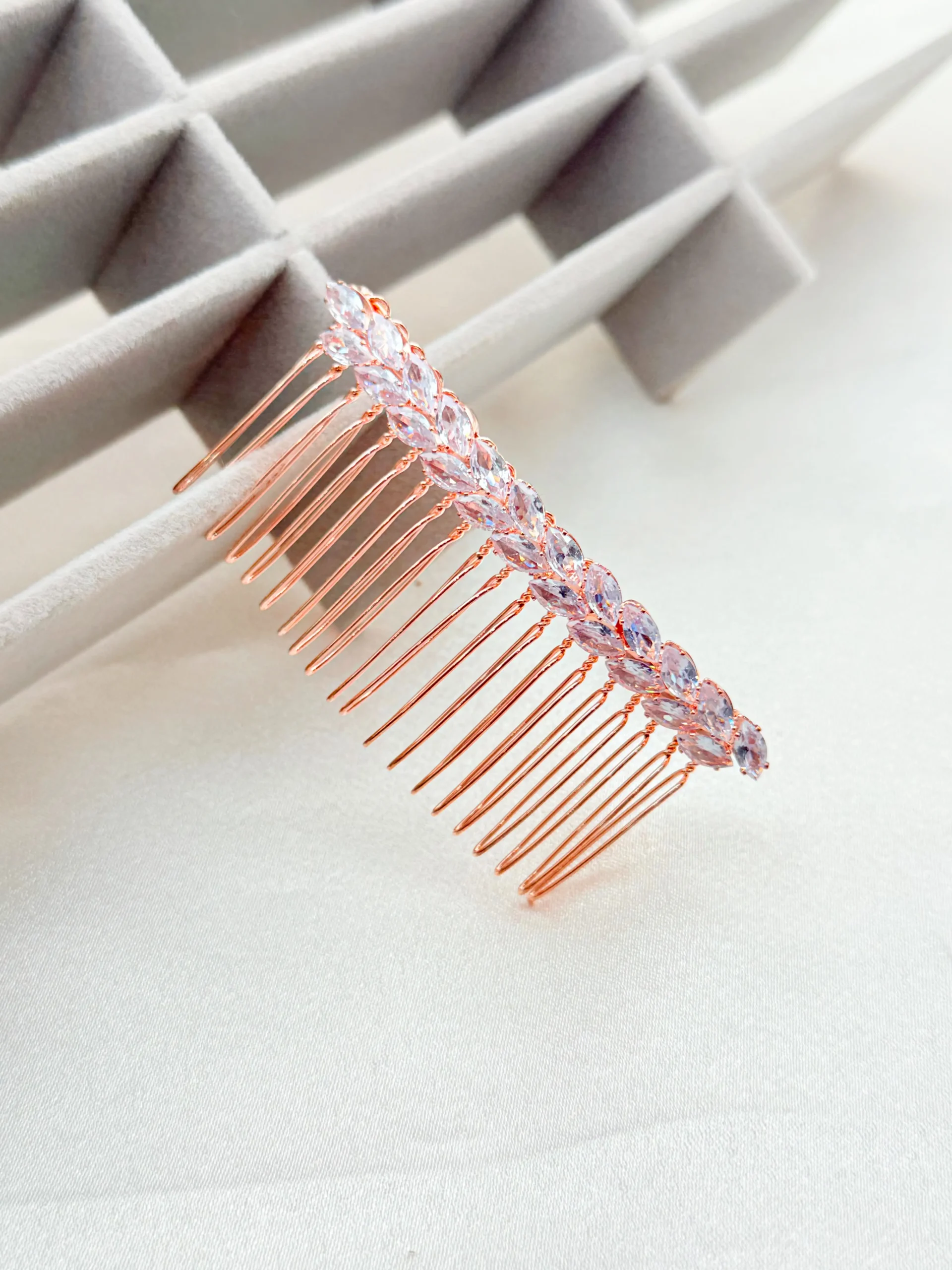 Achieve a look of contemporary elegance with this brilliant Rose Gold Marquise Crystal Leaf Hair Comb. The piece features a shimmering, shaped like delicate leaves—which are clustered together in a graceful vine motif.