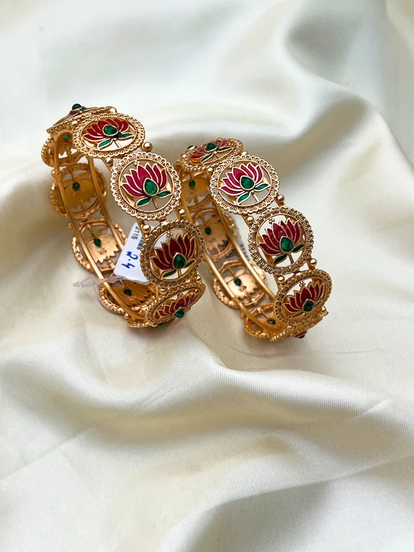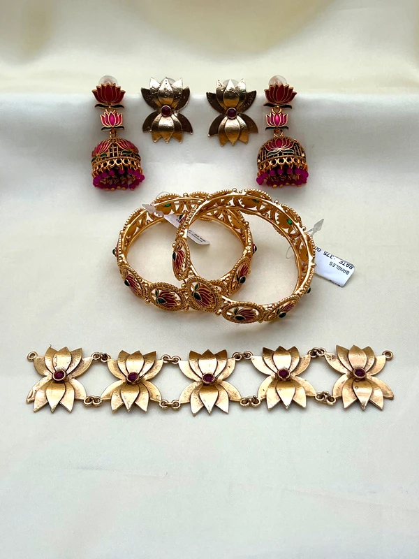 Awaken your inner goddess with this breathtaking Lotus Ruby Gold Necklace Combo Set. Exquisite ruby-centred lotus flowers bloom in rich antique gold-tone, forming a serene choker and matching size 2.4 bangles that shimmer with sacred beauty. Complete with intricate ruby lotus jhumkas and elegant studs, every piece radiates spiritual grace and timeless elegance. Premium matte gold-tone finish offers lasting glow and feather-light comfort.