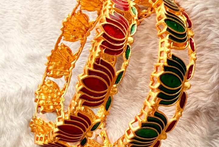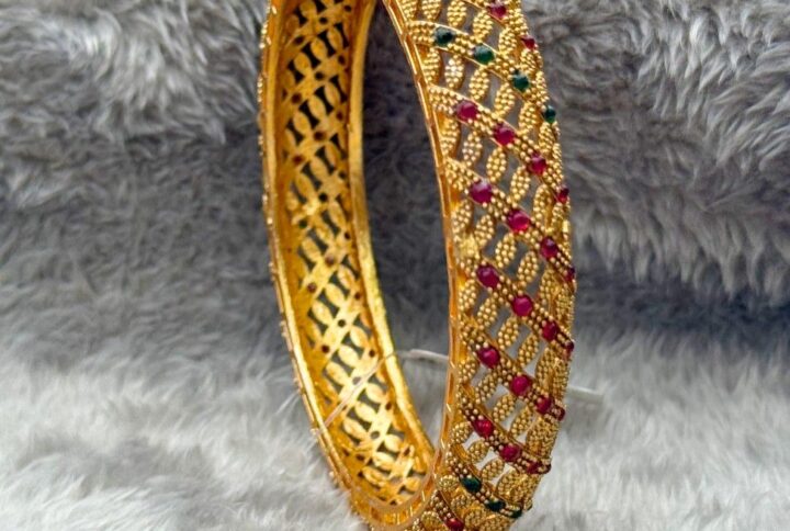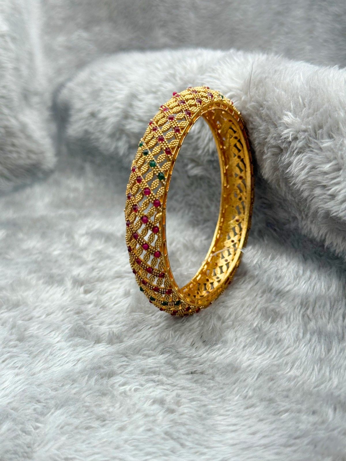 The bangle boasts a rich, matte-finish gold tone that gives it an authentic antique feel. The entire surface is a visual feast, completely covered in a meticulously woven pattern of vibrant, high-quality simulated ruby-red and emerald-green stones. This auspicious color combination and dense stone work create a ‘tapestry’ effect that catches the light from every angle.