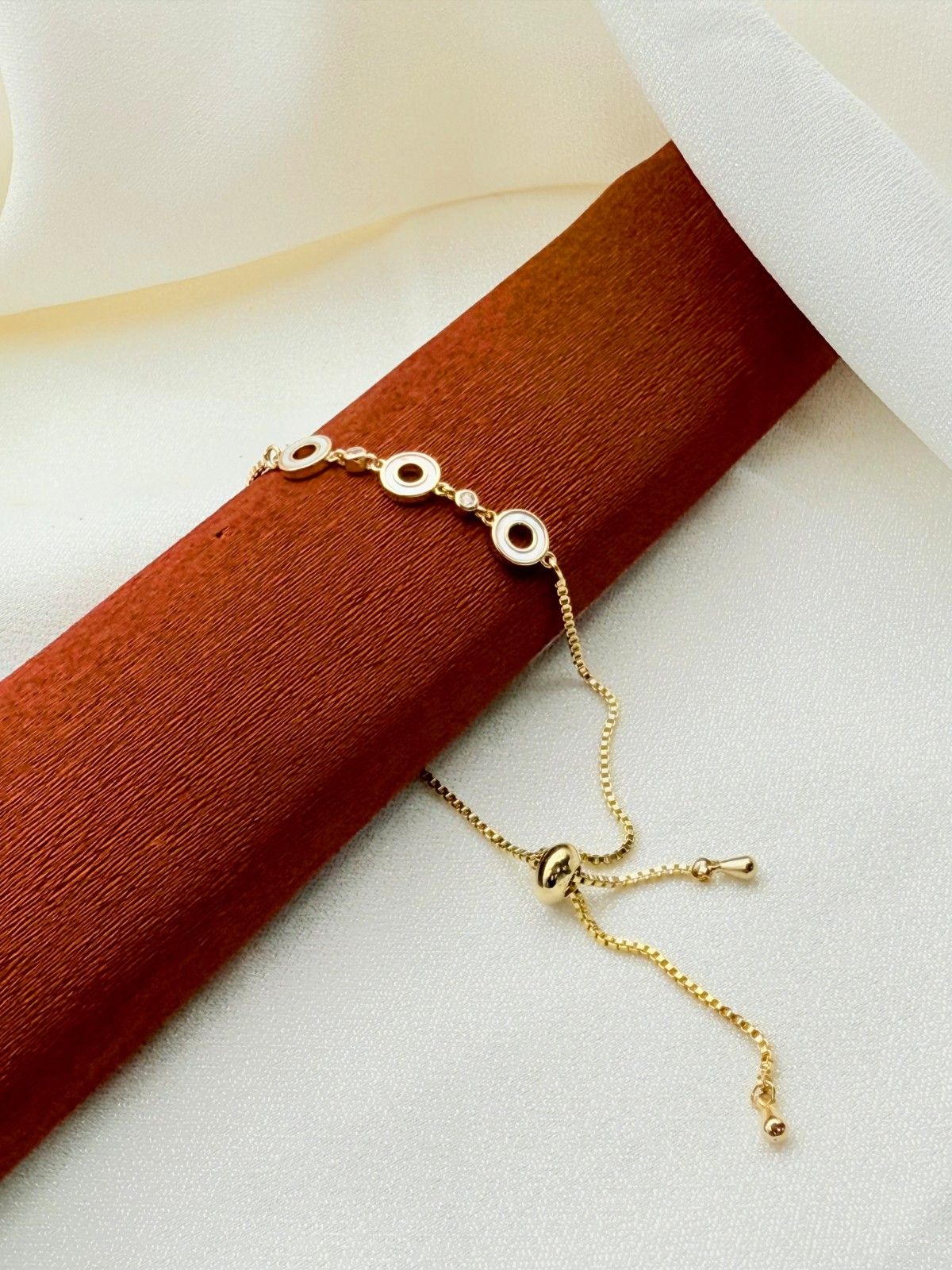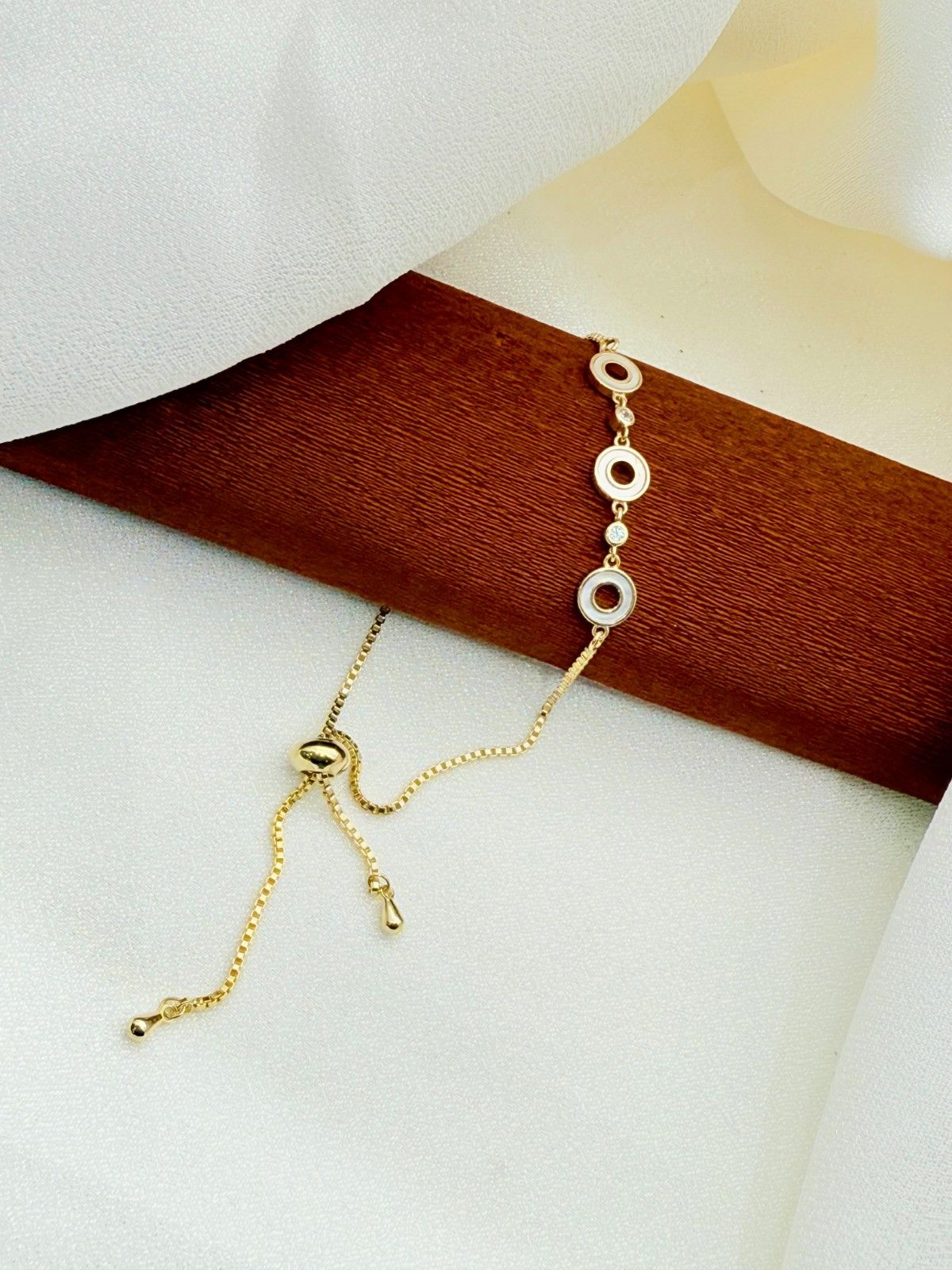 The design showcases a series of delicate gold-tone open circles, some adorned with lustrous white inlay (enamel or mother-of-pearl-like), beautifully interspersed with sparkling white cubic zirconia (cz) stones.